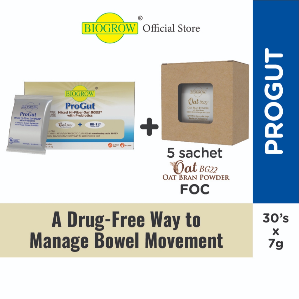 Biogrow ProGut Oat BG22 Oat Bran Powder + BB-12 Probiotics for Constipation Management & Gut Health (30's x 7g)