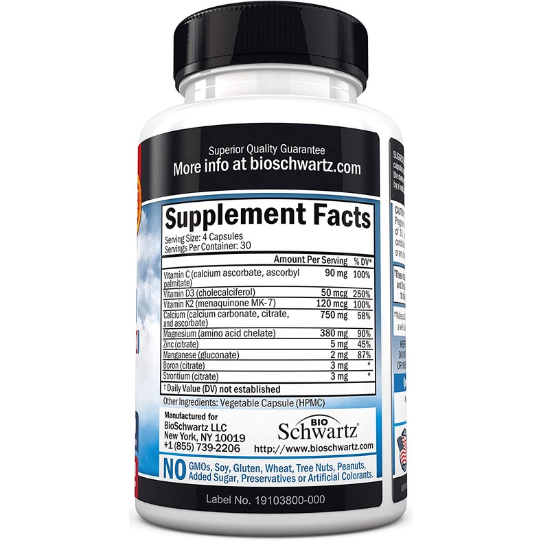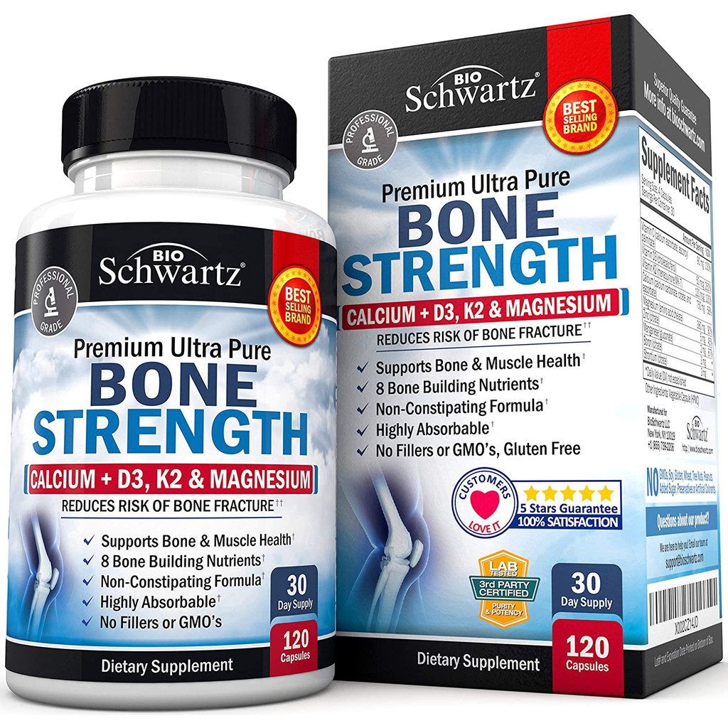 Bone Strength Supplement 120 Veggie Capsules Calcium + D3, K2 & Magnesium Highly Absorbable Vitamin Blend Bone & Muscle Support Non-Constipating Formula 8 Bone Building Nutrients