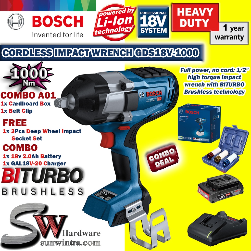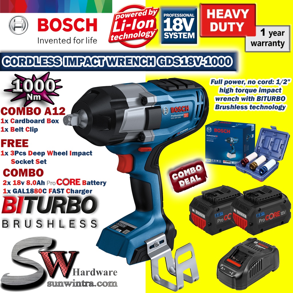 Bosch 1000Nm 1/2" Anvil Cordless Impact Wrench GDS18V-1000 GDS 18V-1000,**SOLO or Battery & Charger Set,F.O.C Socket Set