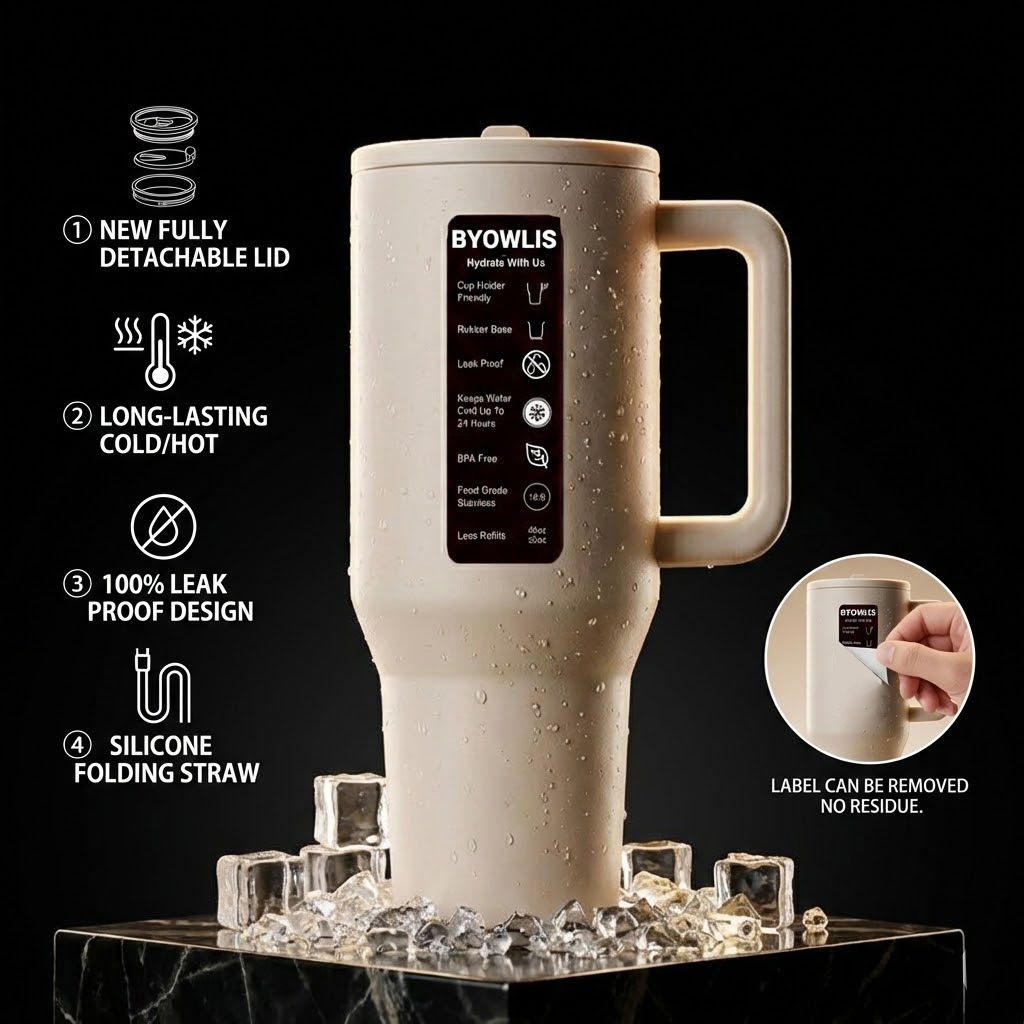 Byowlis 1200ml Straw Tumbler Tahan Sejuk & Panas Leakproof Car Cup Vacuum Insulated Stainless Steel Flask Aesthetic Travel Mug with Handle 2-in-1 Lid Botol Air 冰霸杯 BPA Free