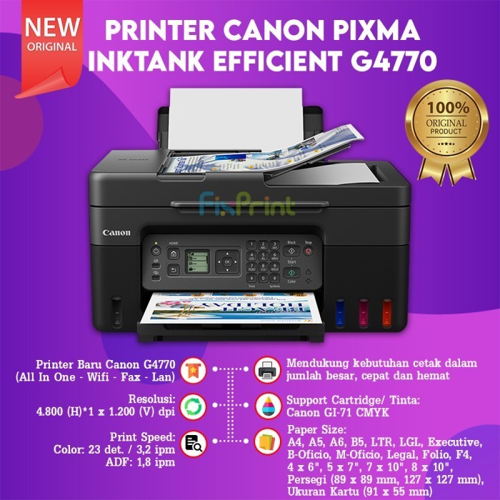 CANON G4770 G4010 /G3020 / G6070 WIRELESS FAX REFILL INK TANK PRINTER