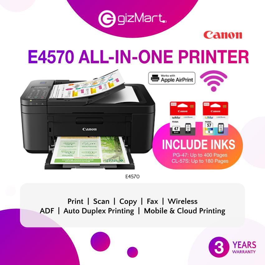 CANON Pixma E4570 Compact Wireless All-In-One Duplex Printing Print/Scan/Copy/ADF/Fax/Wifi/Printer (comes with 2 inks)