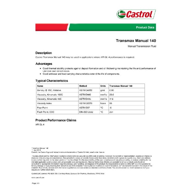CASTROL TRANSMAX MANUAL 140 GL-4 18L GEAR OIL