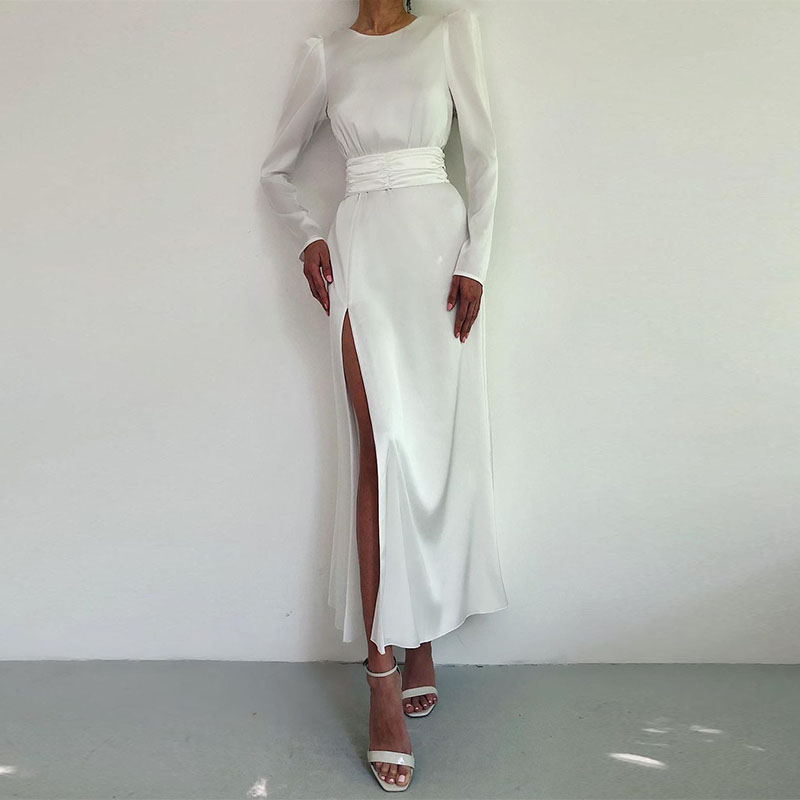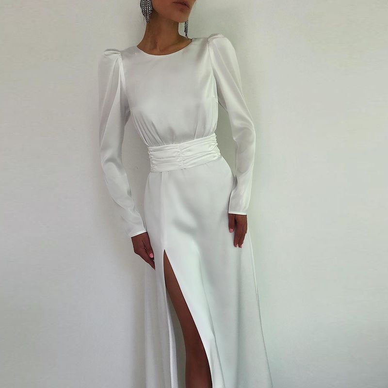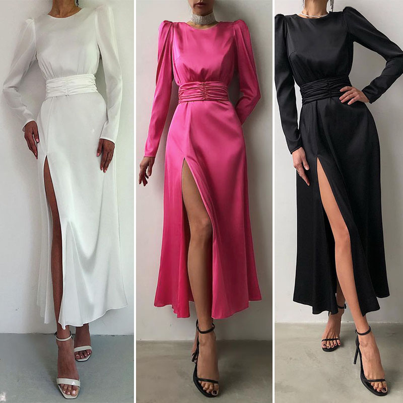 CELMIA Fashion Women Puff Long Sleeve Split Hem Satin Silk Loose Casual Party Dresses