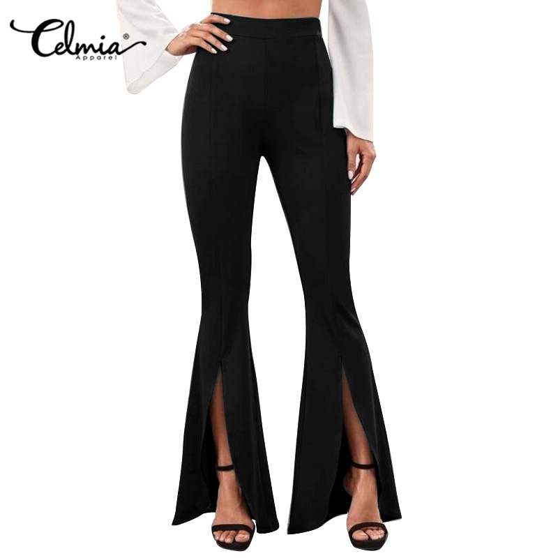 CELMIA Women Flared Elastic High Waist Split Elegant Casual Wide Leg Trousers