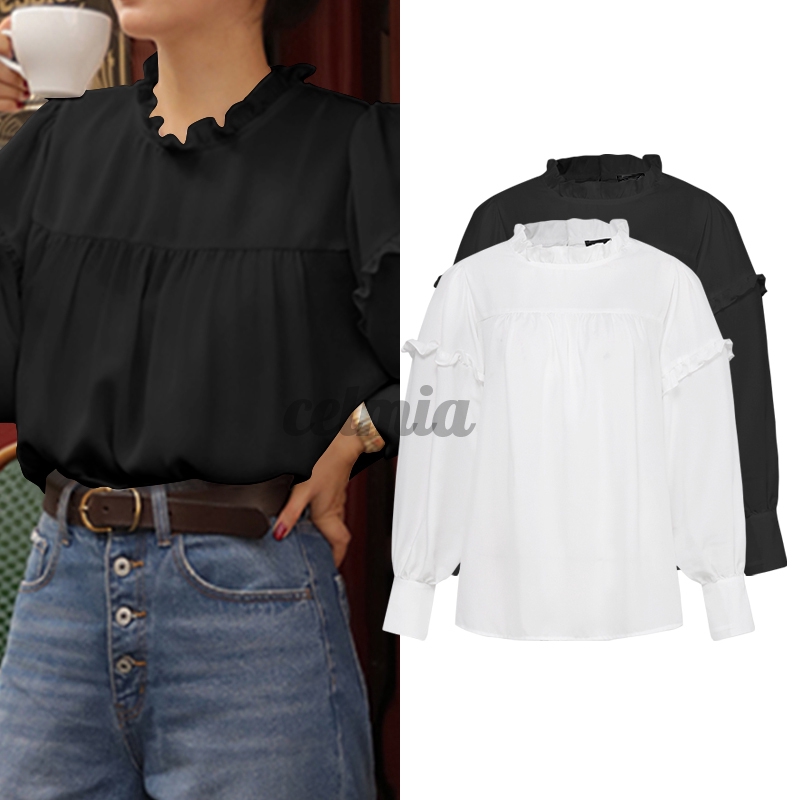 CELMIA Women Long Sleeve Ruffles Collar Elegant Pleated Casual Loose Blouse