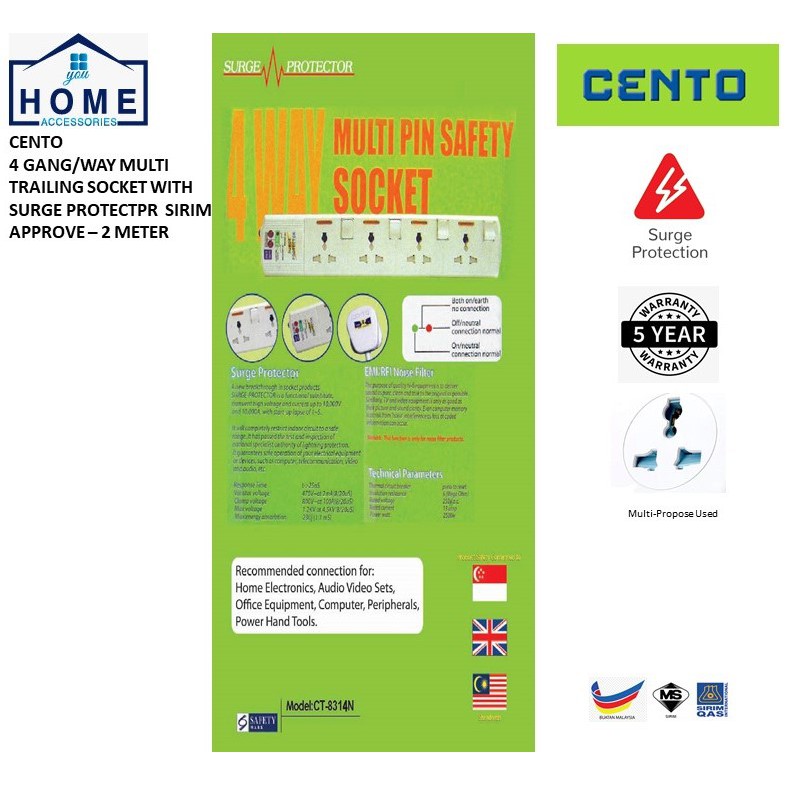CENTO 4 GANG/PORT/WAY MULTI-PIN SAFETY EXTENSION SOCKET SURGE PROTECTOR NEON WITH SIRIM APPROVE