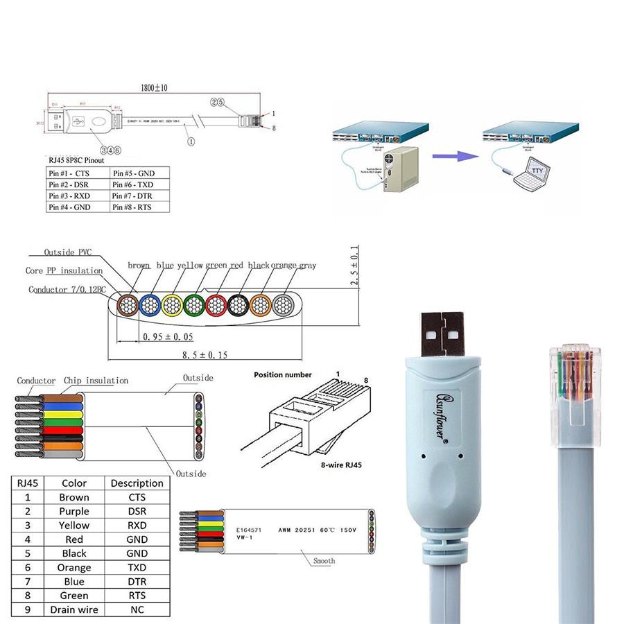 CH340 PL2303 USB Serial RS232 to RJ45 Console Rollover Cable For Cisco Routers 1M 1.8M 3M 5M