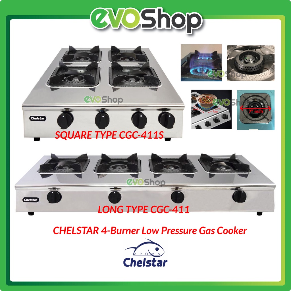 CHELSTAR 4 Burner Stainless Steel Gas Cooker Low Pressure Stove CGC-411S Square or CGC-411 Long Dapur Claypot Masak