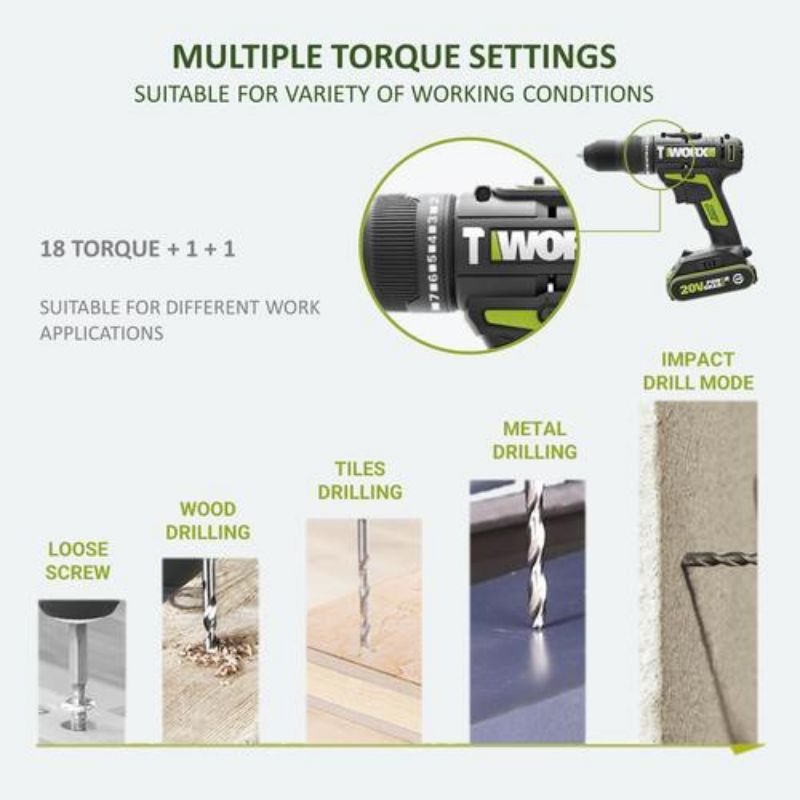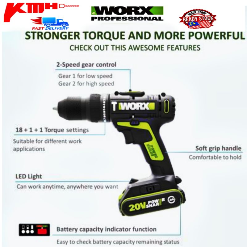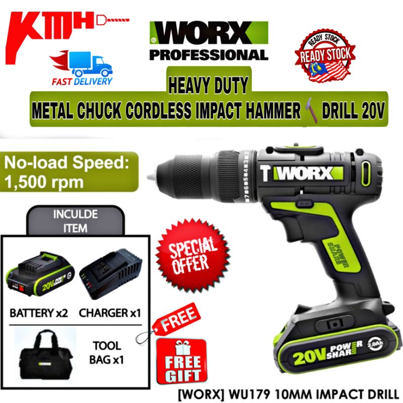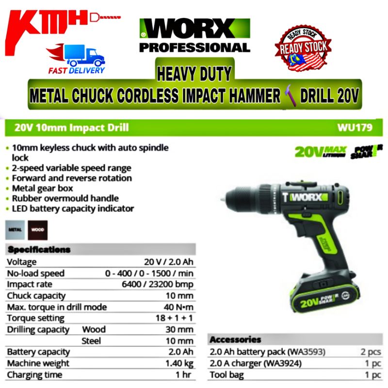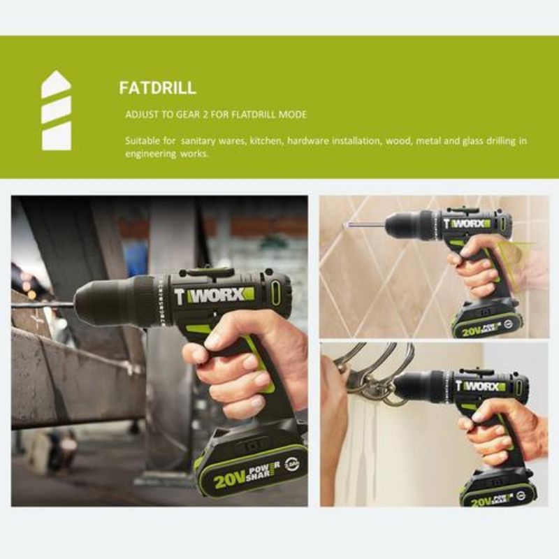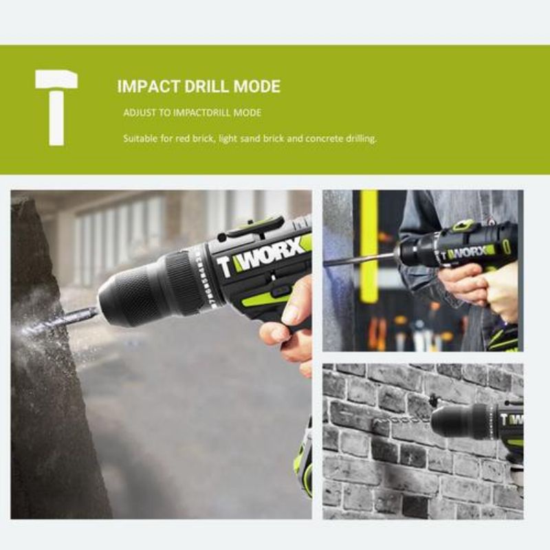 CORDLESS IMPACT DRILL WORX WU179 20V 2.0Ah Max Lithium-Ion Cordless 10mm 20V Drill Driver - Double Battery Drill Driver