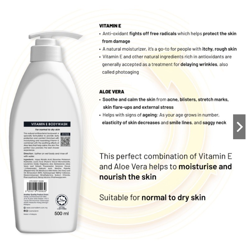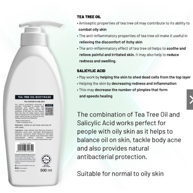 COSMODERM Body Wash 500 mL (Tea Tree Oil + Salicylic Acid / Vitamin E + Aloe Vera / Niacinamide + Licorice)