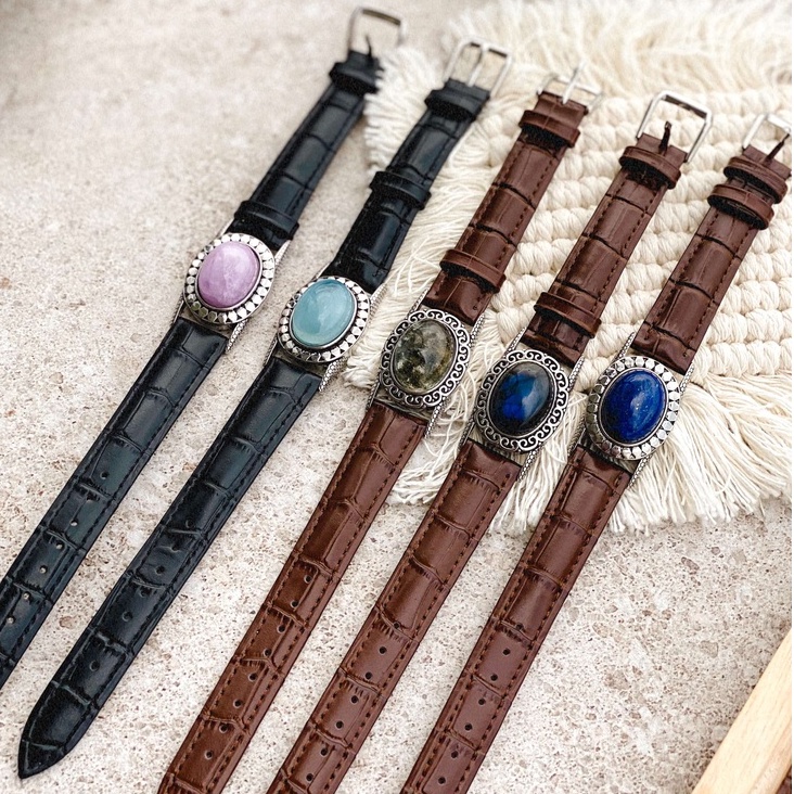 CRISTY CRYSTALS Unique Design Watch Strip Aquamarine Black Obsidian Kunzite
