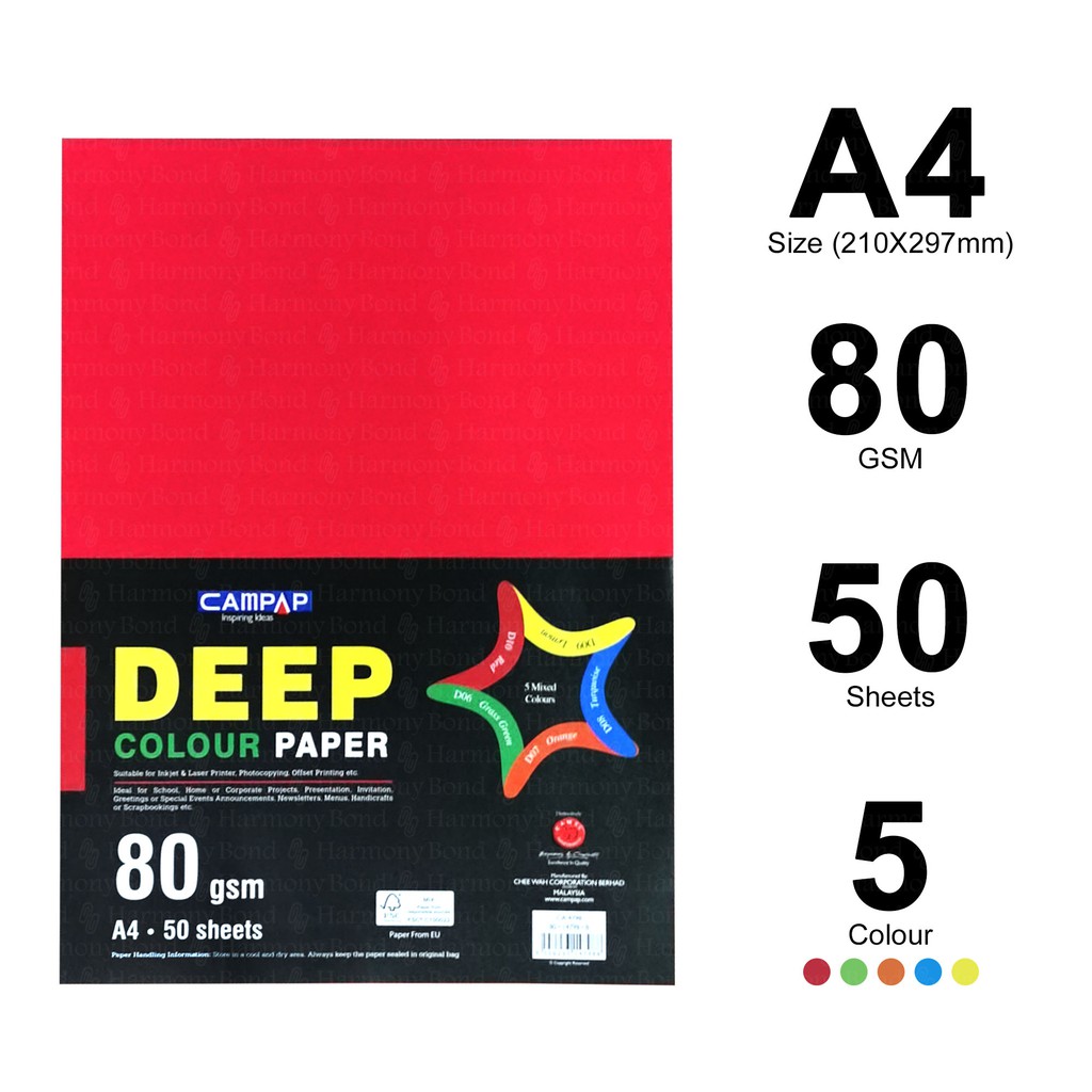 Campap Premium Deep Colour Paper | Kertas Warna (CA4798 / A4 / 5 Mix Colour / 80GSM / 50 Sheets)