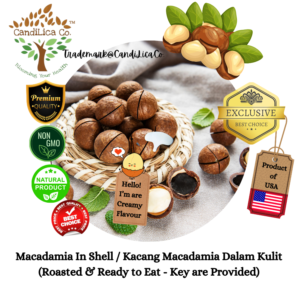 Roasted Macadamia In Shell | Kacang Macadamia Dalam Kulit | 烘烤夏威夷果 – CandiLica Co. – USA Import – 250g/500g/1kg