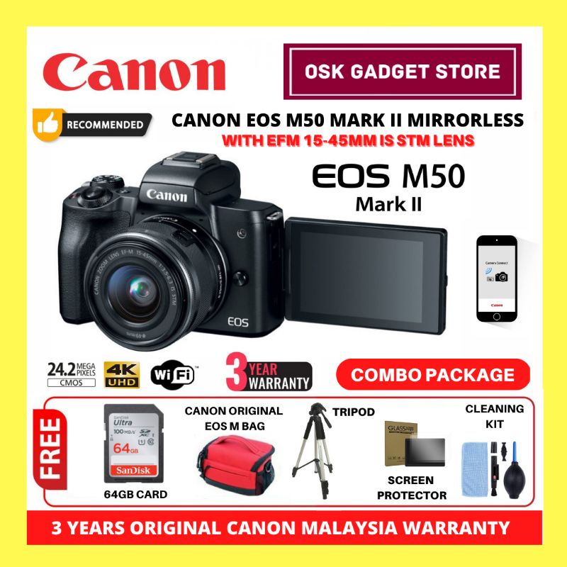 Canon EOS M50 II M50 Mark 2 M50II Kit 15-45MM IS STM Lens | Bundle Package | 3 Years Canon Malaysia Warranty