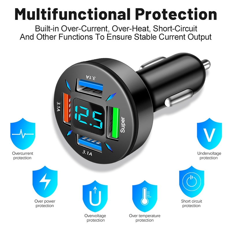 Car Charger LED Display Phone Charger 4USB Ports Digital Display Super Fast Charging Suitable for 12V/24V Cars