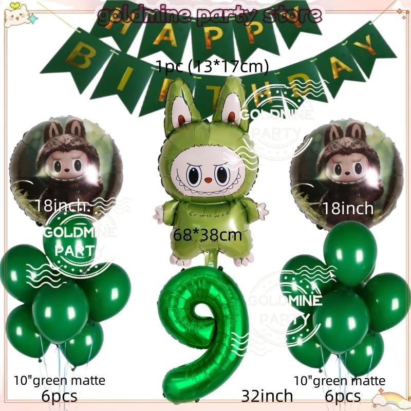 Cartoon Labubu Balloon Green Number Foil Latex Balloon Cute Labubu Family Birthday Party Decoration