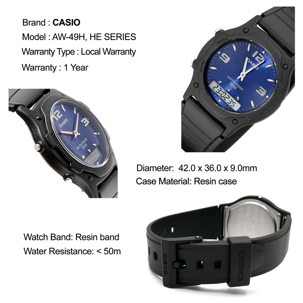 Casio AW-49H AW-49HE Analog Digital Black Resin Band Unisex Watch Jam Tangan Unisex