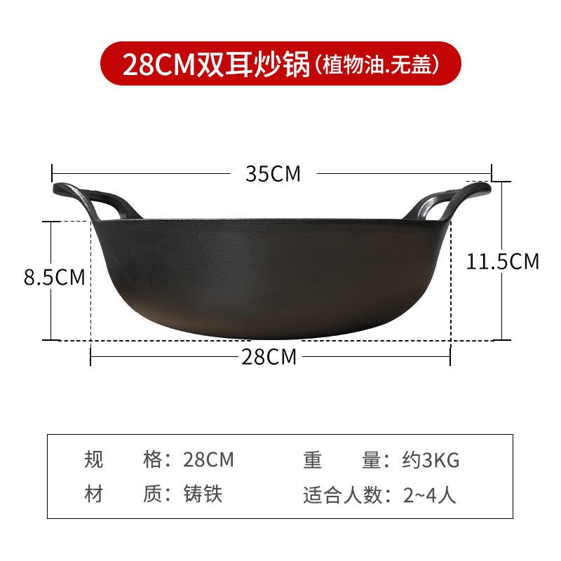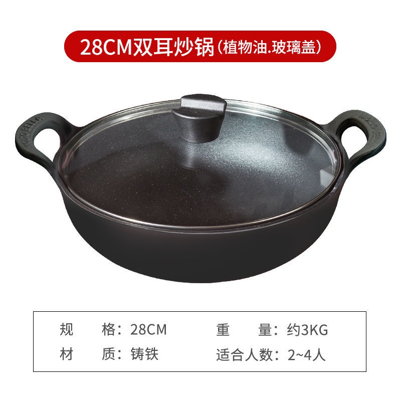 Cast Iron Wok Smokeless Pan Double-Ear Old-Fashioned Frying Pan Enamel Uncoated Cast Iron Non-Stick Pan Deepening round Bottom