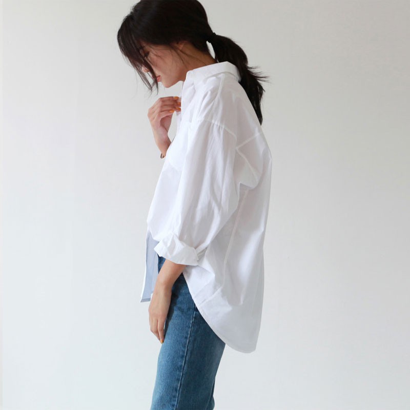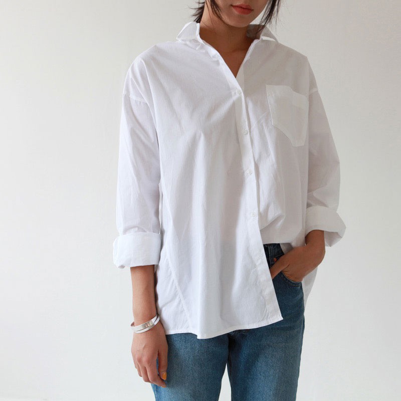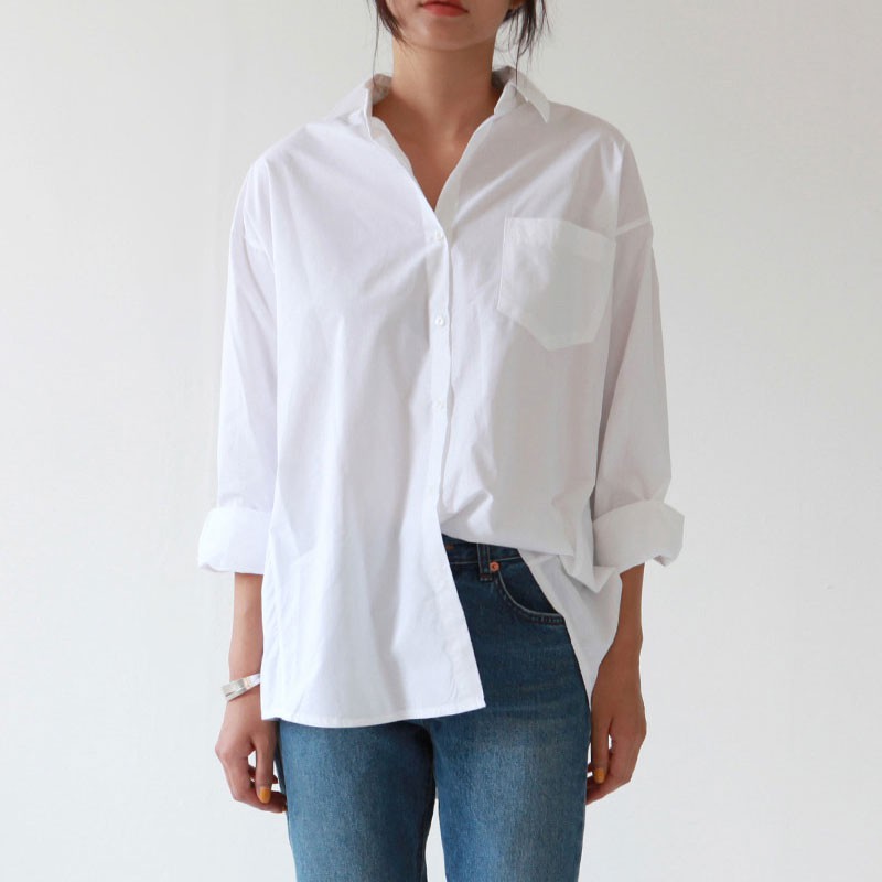 Casual Loose Women Shirts Plus Size Blouse Long Sleeve Pocket White Shirt Cotton Tops