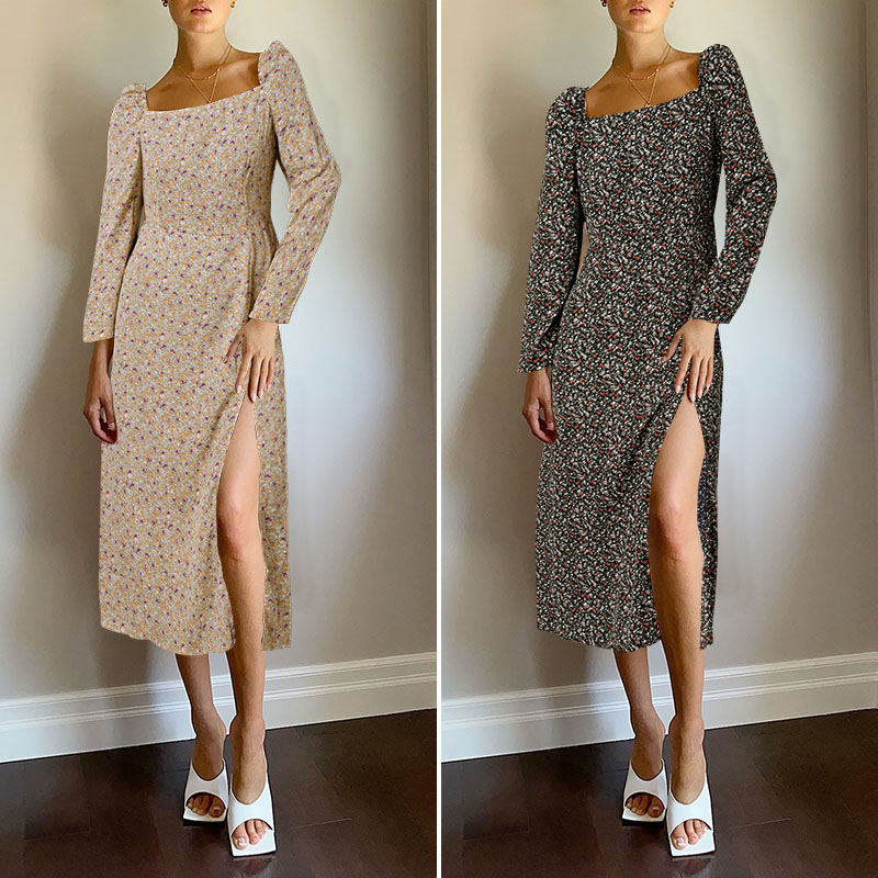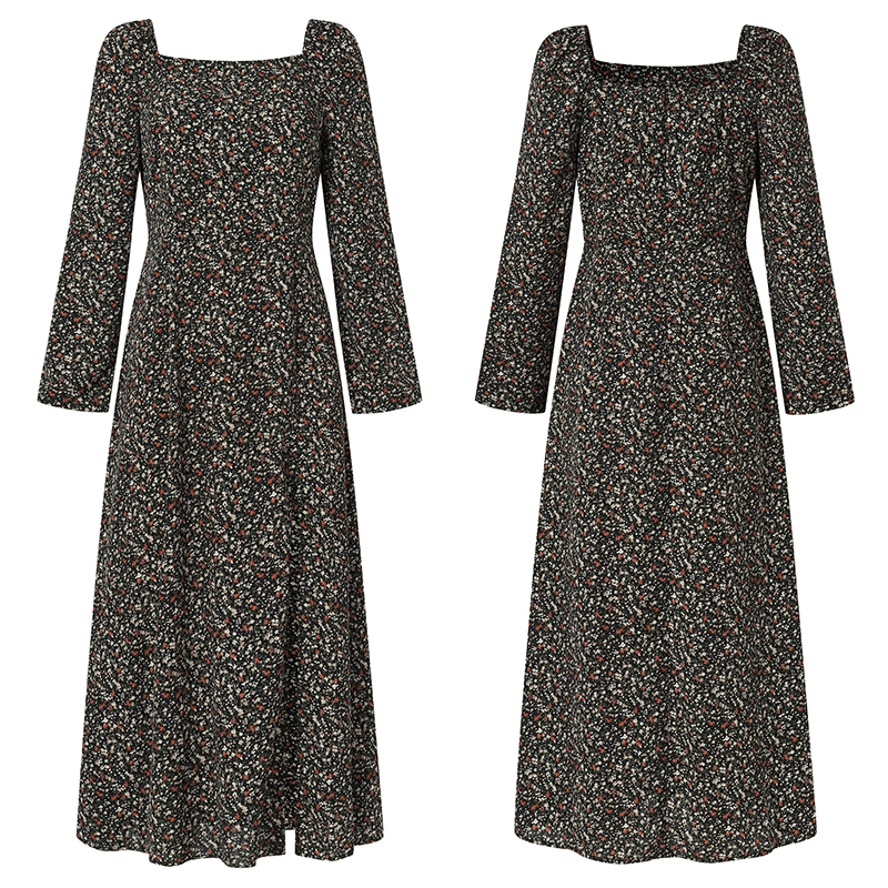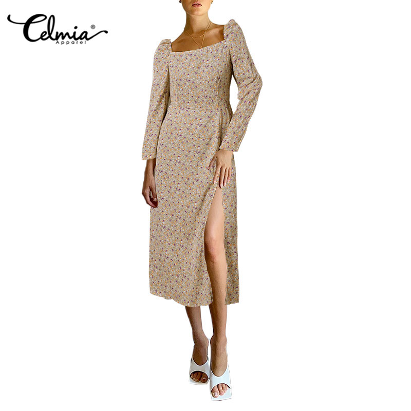 Celmia Women Long Sleeve Floral Bohemian Square Collar Split Holiday Party Casual Long Dresses
