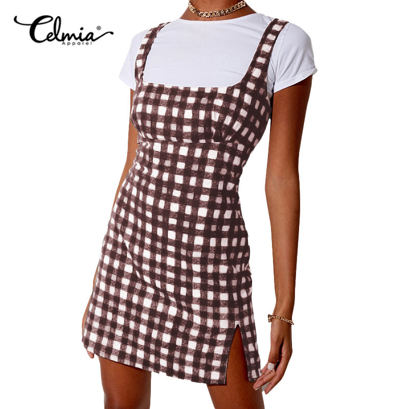 Celmia Women Summer Plaid Sleeveless Slit Hem Casual Slim Dress