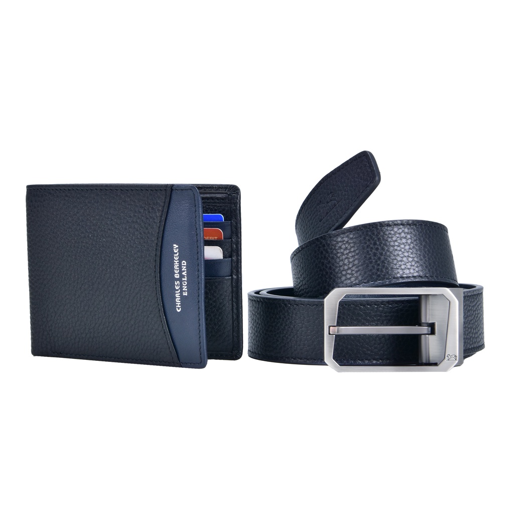 Charles Berkeley Tumbled Leather Bifold Wallet & Belt Gift Set Wallet Lelaki Men's Wallet (Pearl Satin Brushed Buckle)