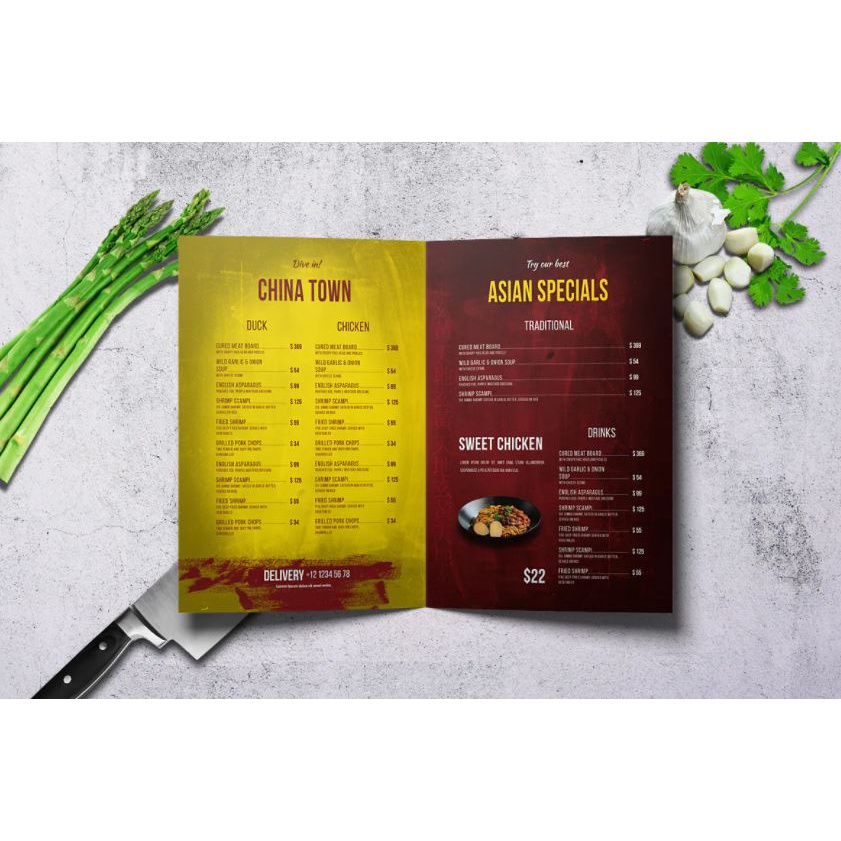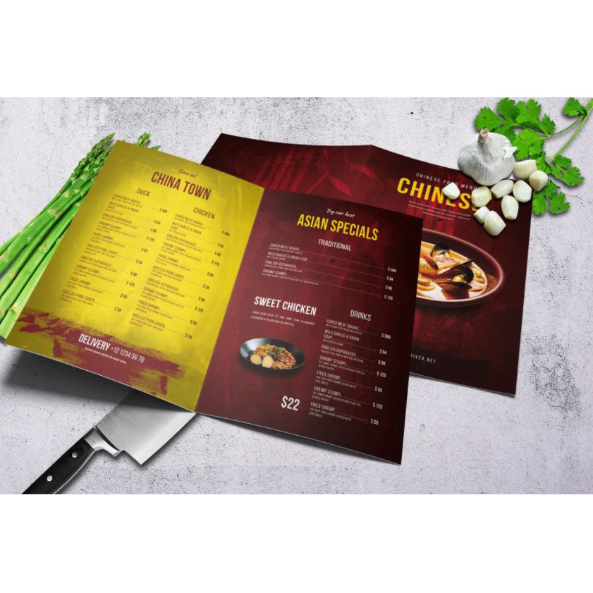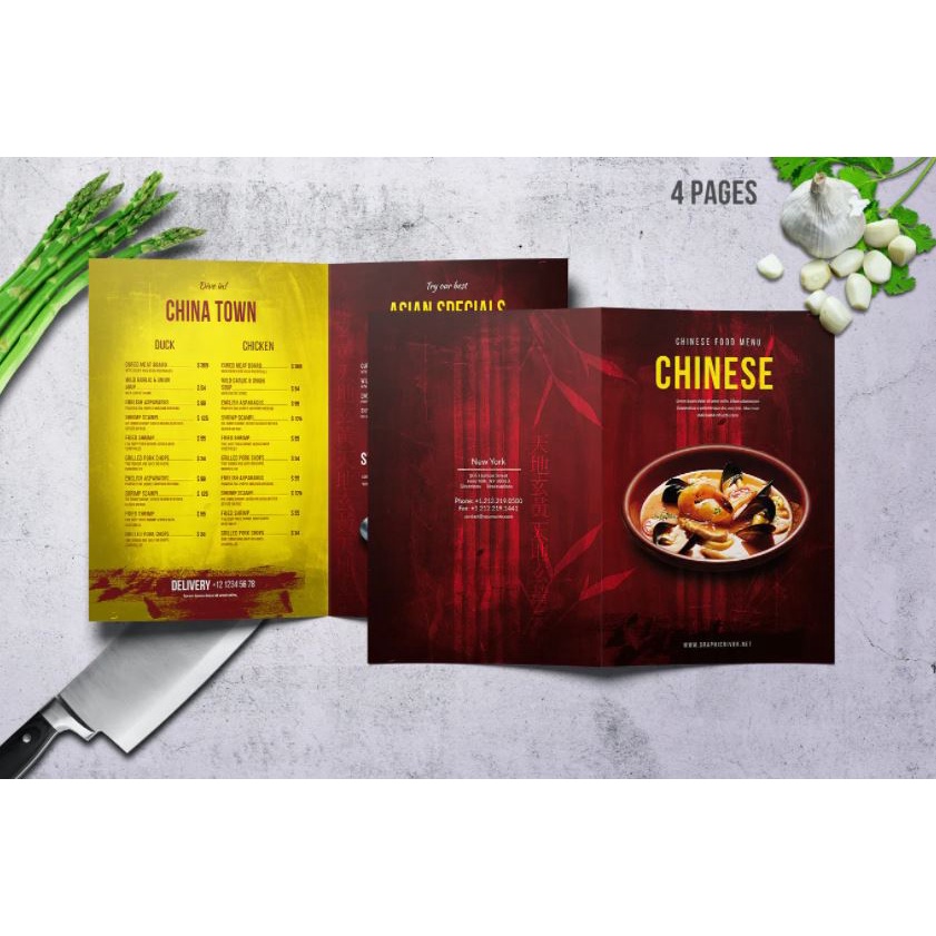 Chinese A4 & US Letter Food Menu Template - Bifold A4 Food Menu PSD Template