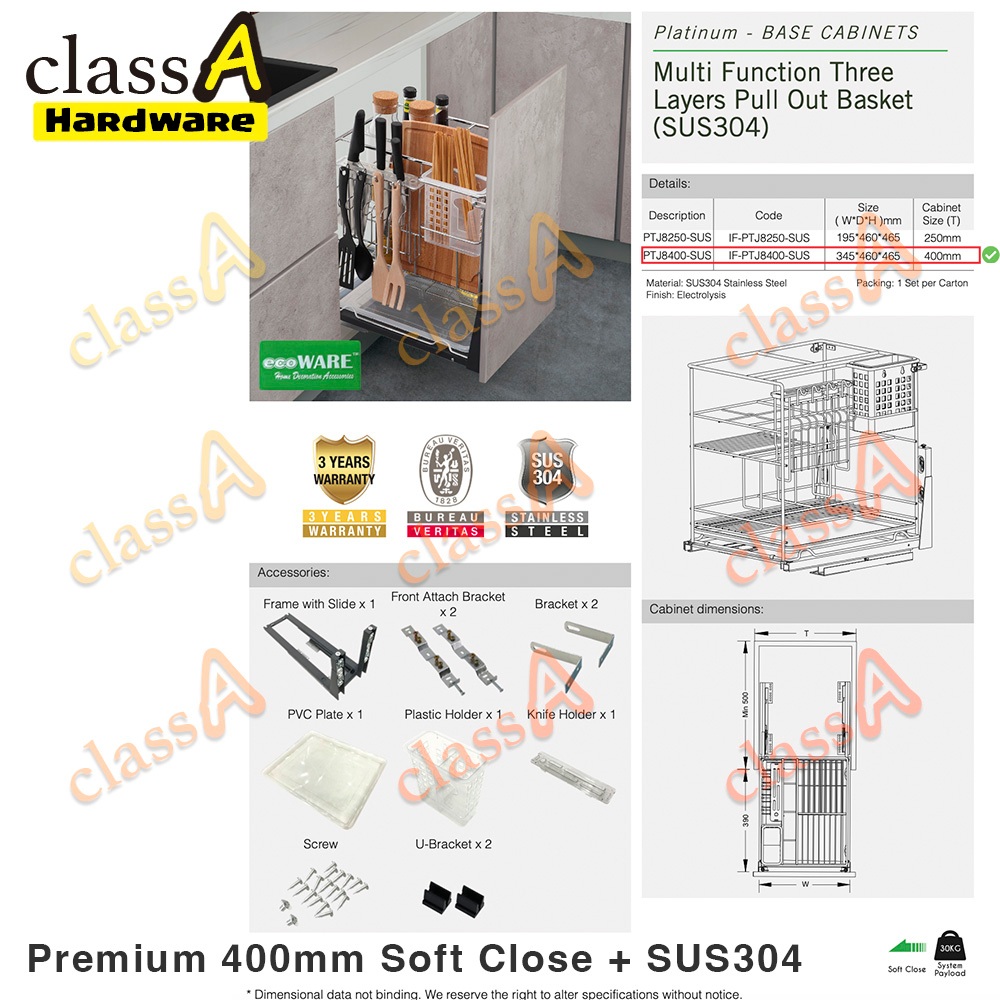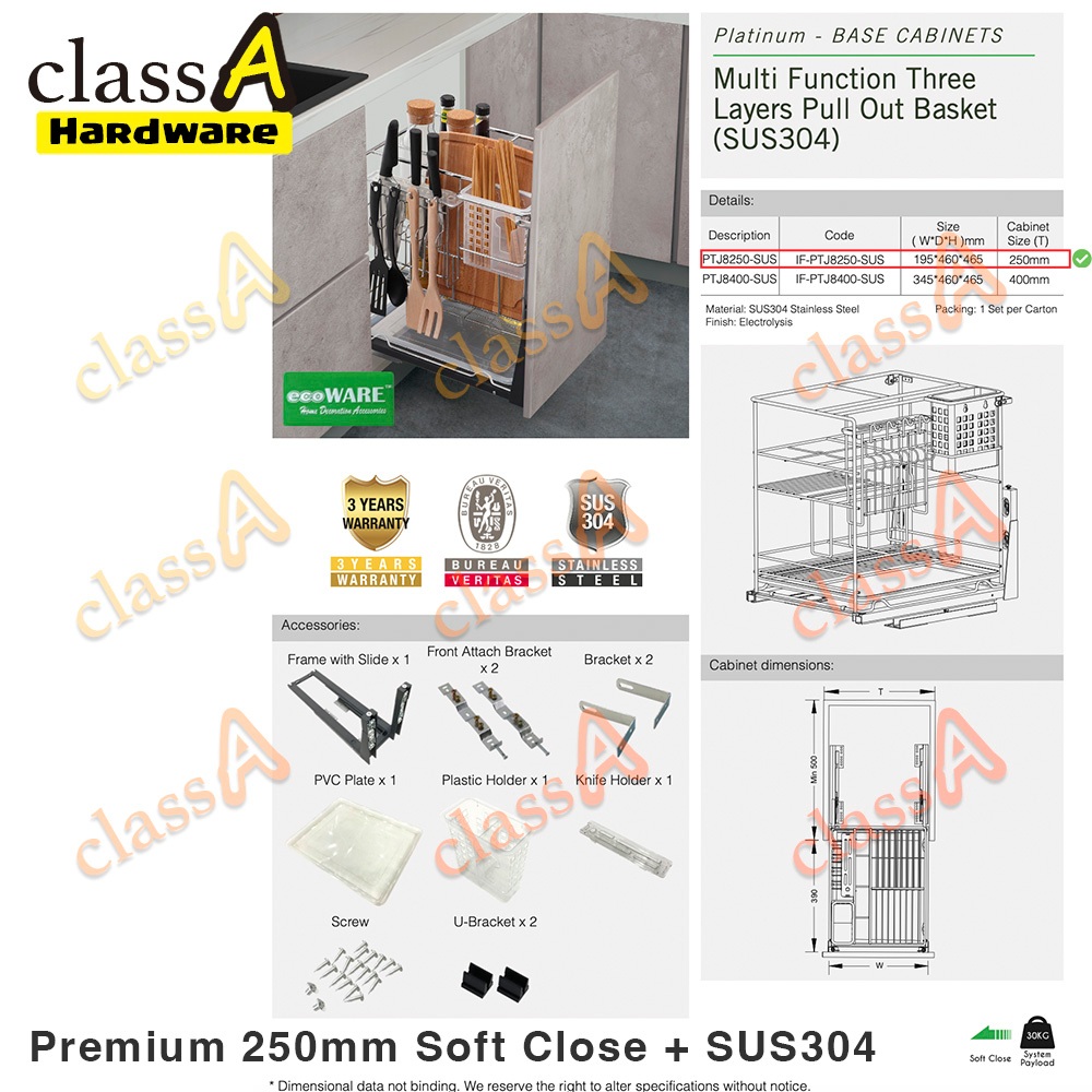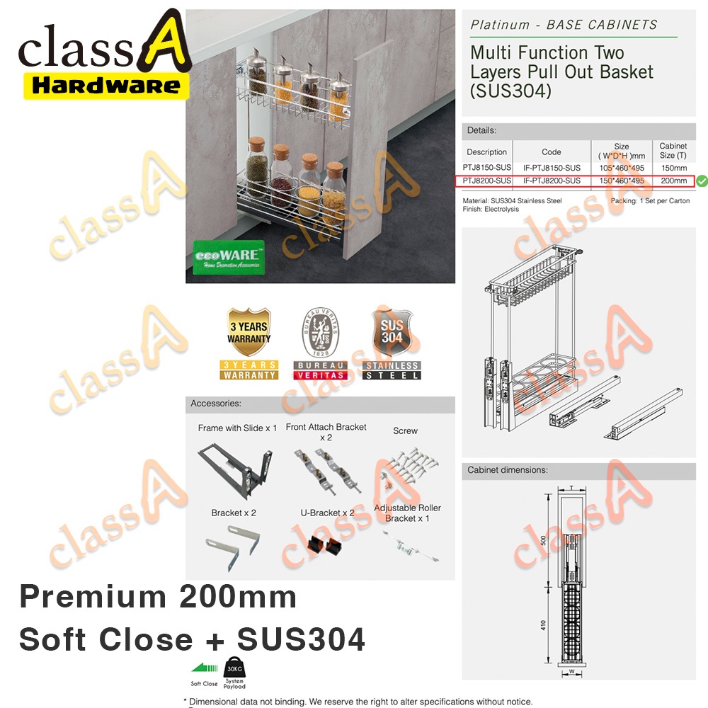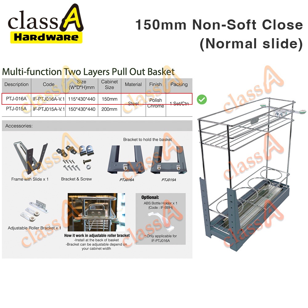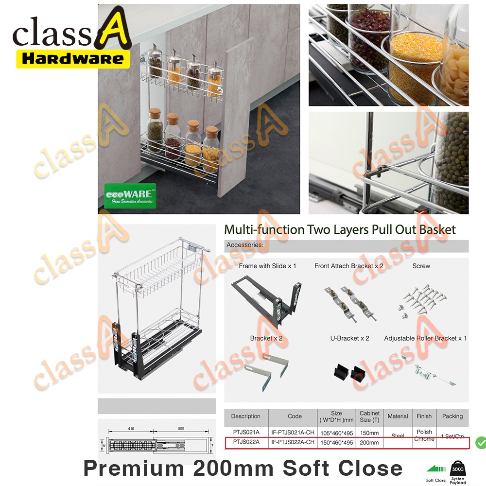 ClassAHW Multi-Function Kitchen Cabinet Two Layer Pull Out Basket Premium Quality Soft Close Slide 150mm 200mm 300mm