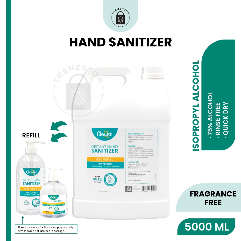 Cleanse360 Hand Sanitizer 75% Alcohol [Gel Refill - 5000ml / 5L / 5 Liter] [Ethanol / IPA Alcohol]