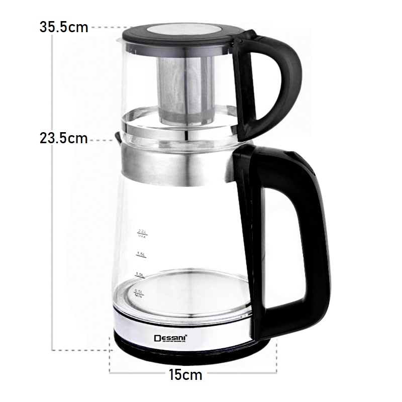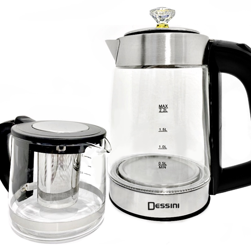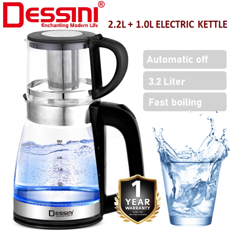【ORIGINAL】 DESSINI ITALY 2.2L + 1.0L Glass LED Light Electric Kettle Automatic Cut Off Boiler Jug Teapot / Cerek
