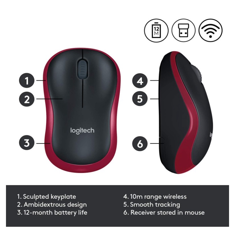 Logitech M185 Wireless Mouse Grey Blue Red 1000DPI 2.4GHz USB Nano Receiver Compact Design