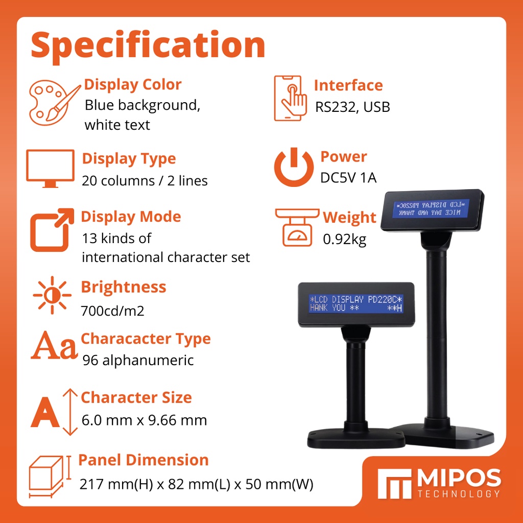 Customer Display/ Pole Display POS VFD Display LCD MC3220 for All Windows POS Software (USB)