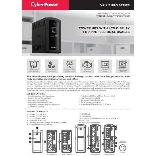 Cyberpower VP1000EILCD 550W UPS Power Backup Battery Line Interactive for Computer Modem Router CCTV similar PRO901WS