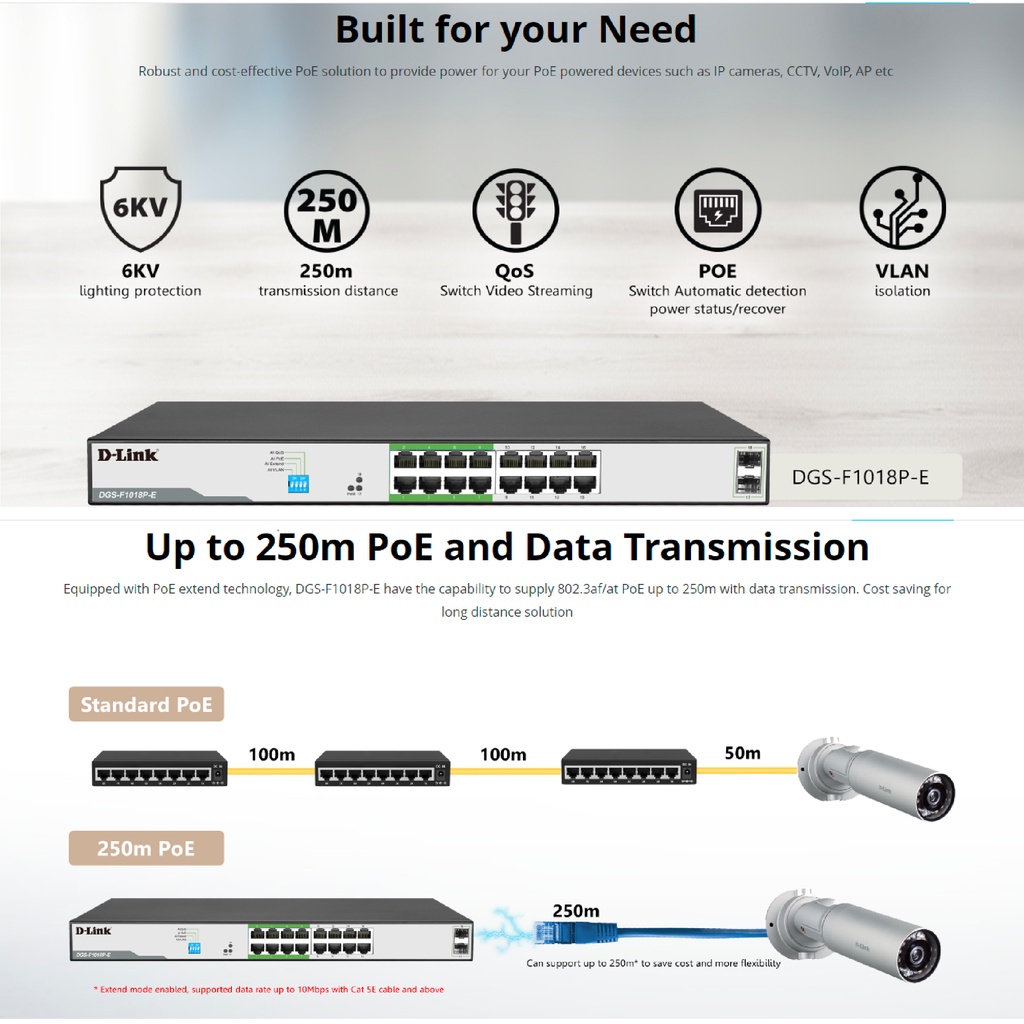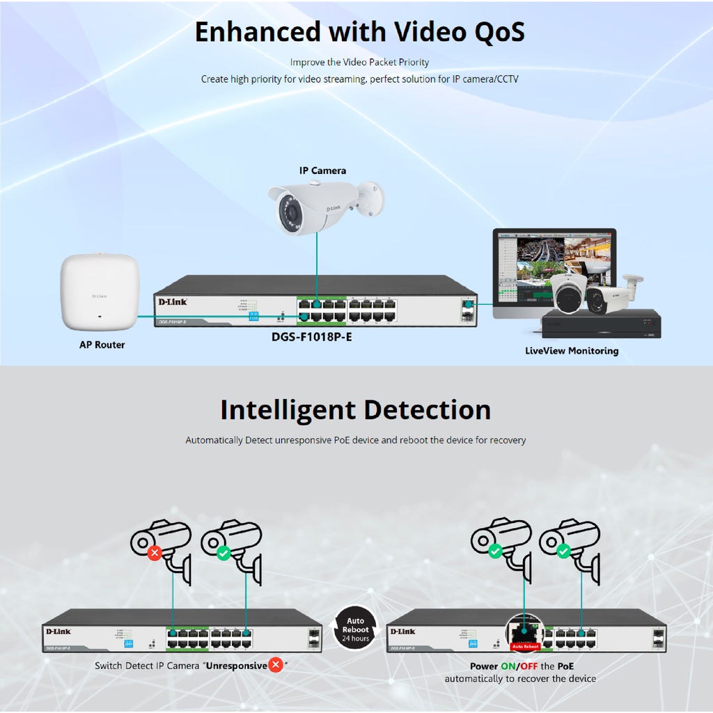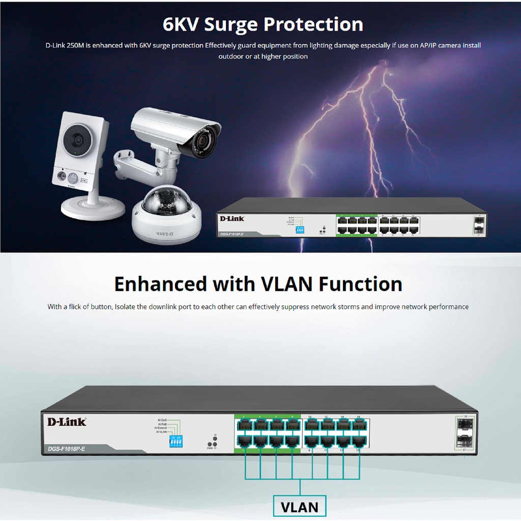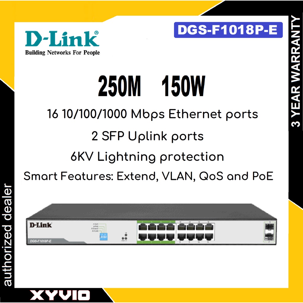D-LINK DGS-F1018P-E 250M 16 1000Mbps PoE Switch with 2 SFP Ports PoE Switchs