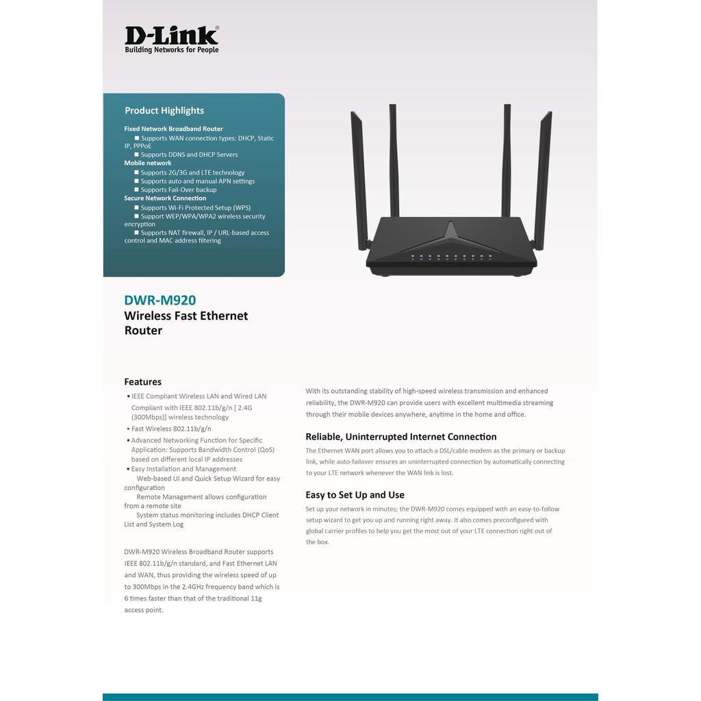 D-Link N300 4G LTE Sim Card Wireless Router build in VPN Client with 4 external antenna support all telco band DWR-M930