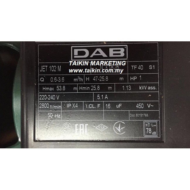 DAB Italy Self Priming Pump JET 102M 1HP Single Phase Max Head 53.8m