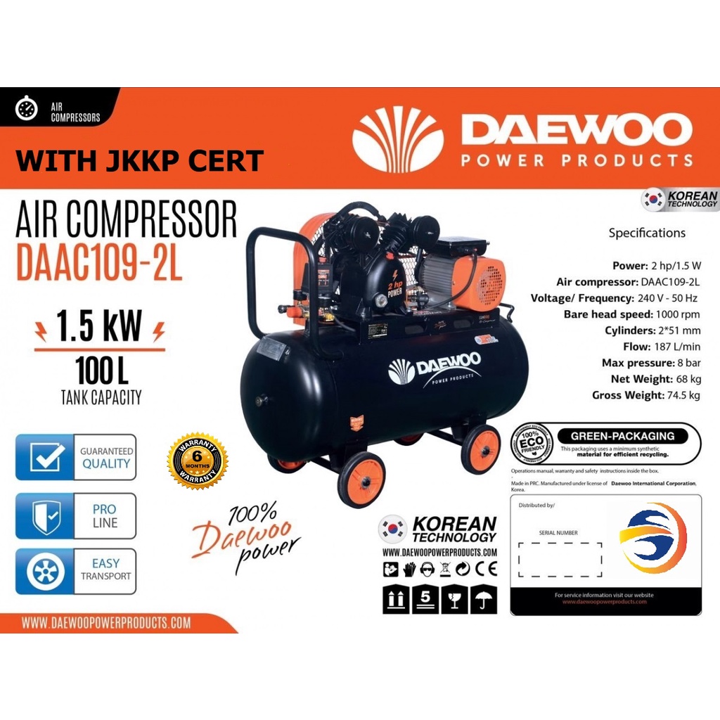 DAEWOO AIR COMPRESSOR 2HP/100L/8BAR BELT DRIVEN WITH JKKP CERTIFICATE - MODEL : DAAC109-2L