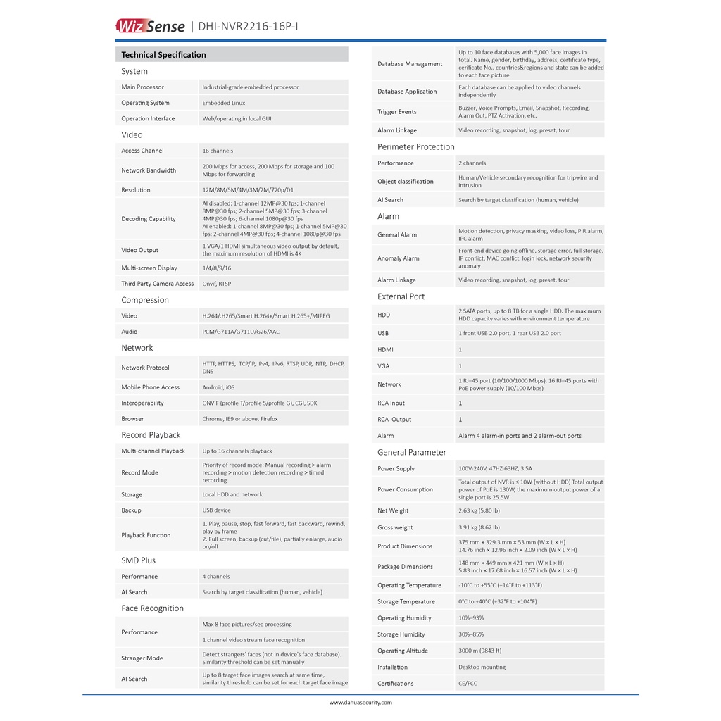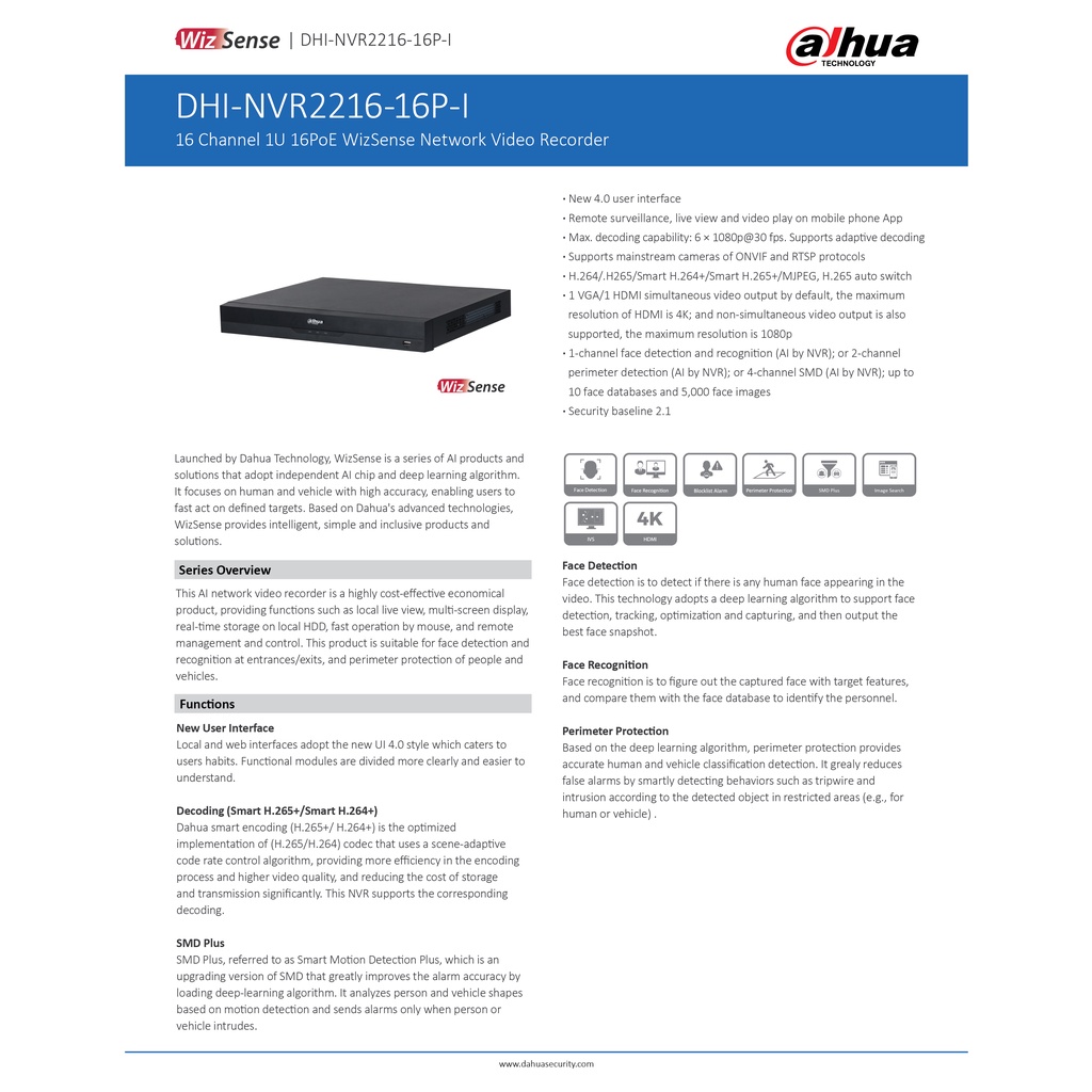 DAHUA 16 CHANNEL NVR2216-16P-I2 CCTV Recorder H.265 Build In 16 PoE Port Support 2 HDD Slot 1U WizSense | Billionmark