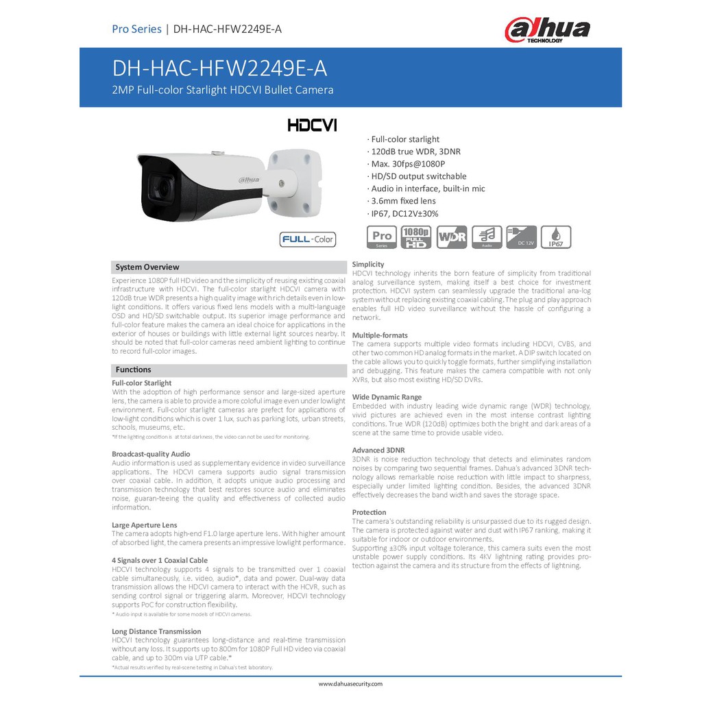 DAHUA 2MP ANALOG HAC-HFW2249E-A-NI FULL COLOR STARLIGHT HDCVI MICROPHONE (BUILT-IN MIC) BULLET CAMERA