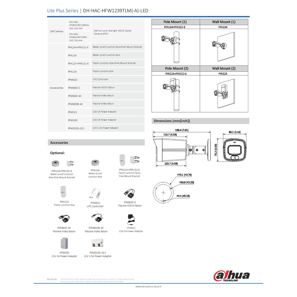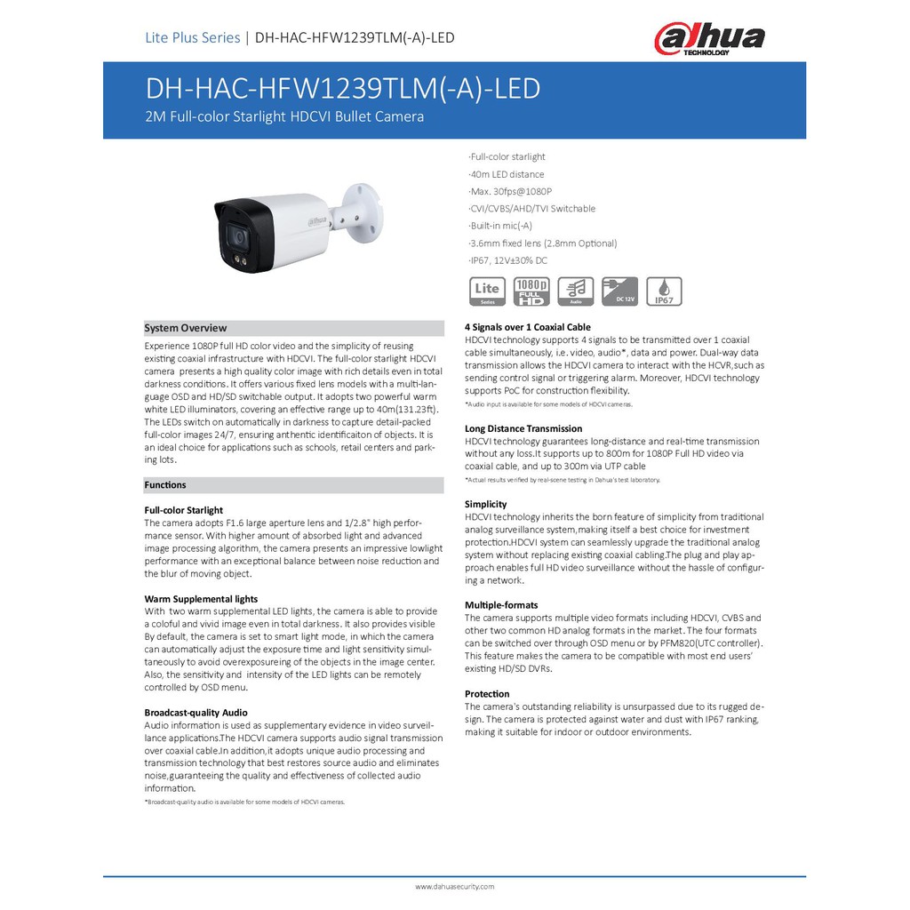 DAHUA 2MP ANALOG HFW1239TLM-A-LED FULL COLOR STARLIGHT HDCVI BULLET MICROPHONE (BUILT-IN MIC) OUTDOOR BULLET CAMERA