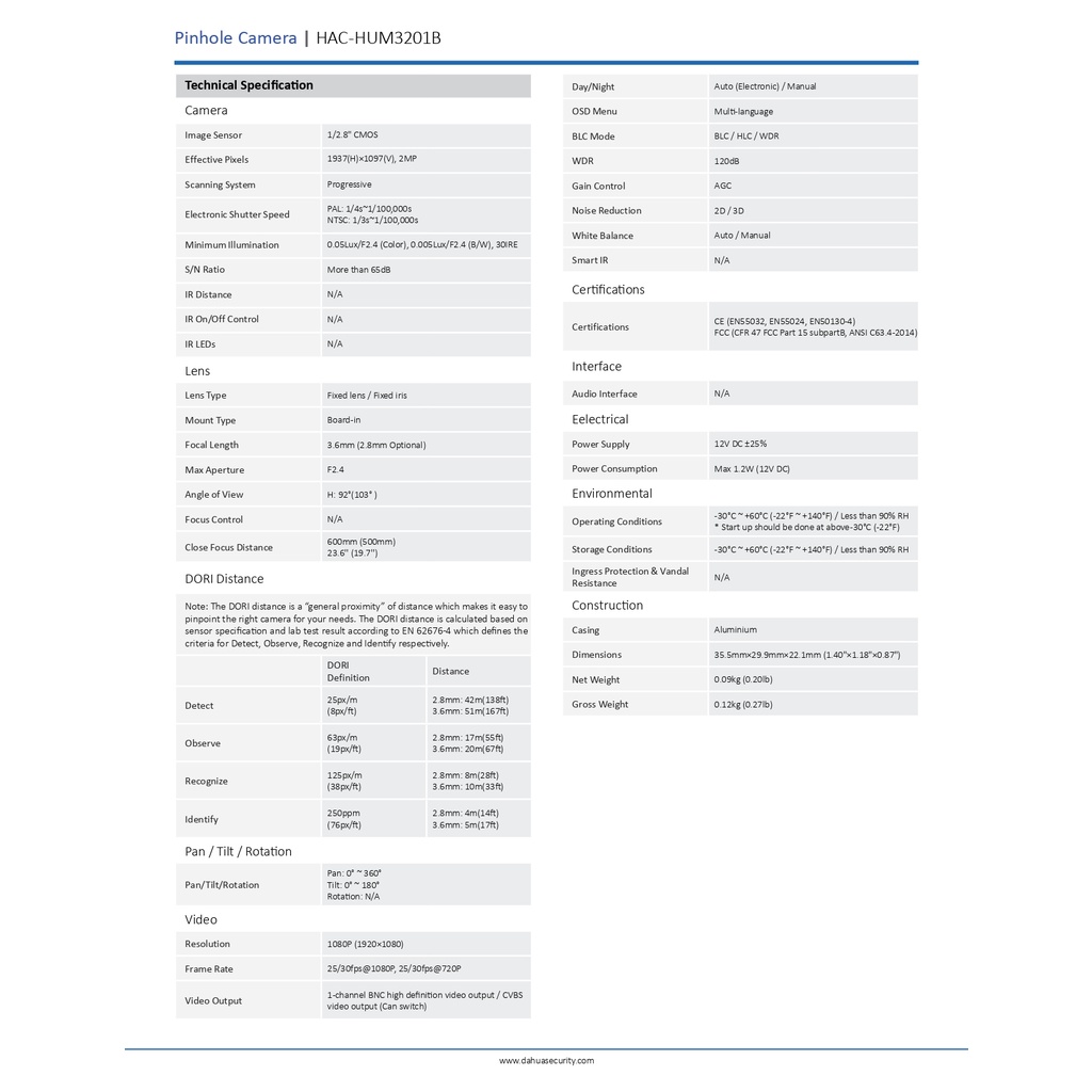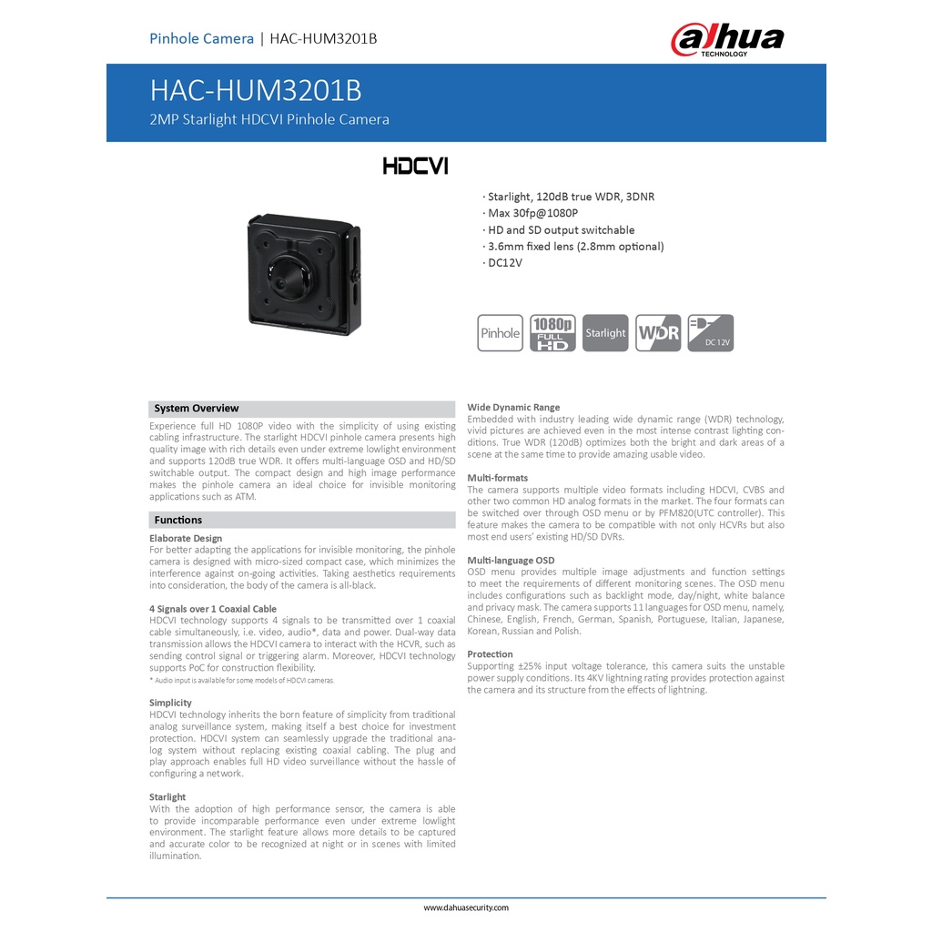 DAHUA 2MP STARLIGHT HDCVI PINHOLE CAMERA - HUM3201B