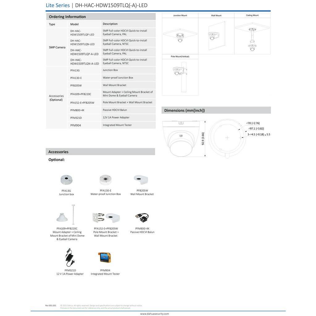 DAHUA CVI 5MP 2.8MM DOME CAMERA FULL-COLOR STARIGHT HDCVI EYEBALL HAC-HDW1509TLQ(-A)-LED CCTV FOR INDOOR
