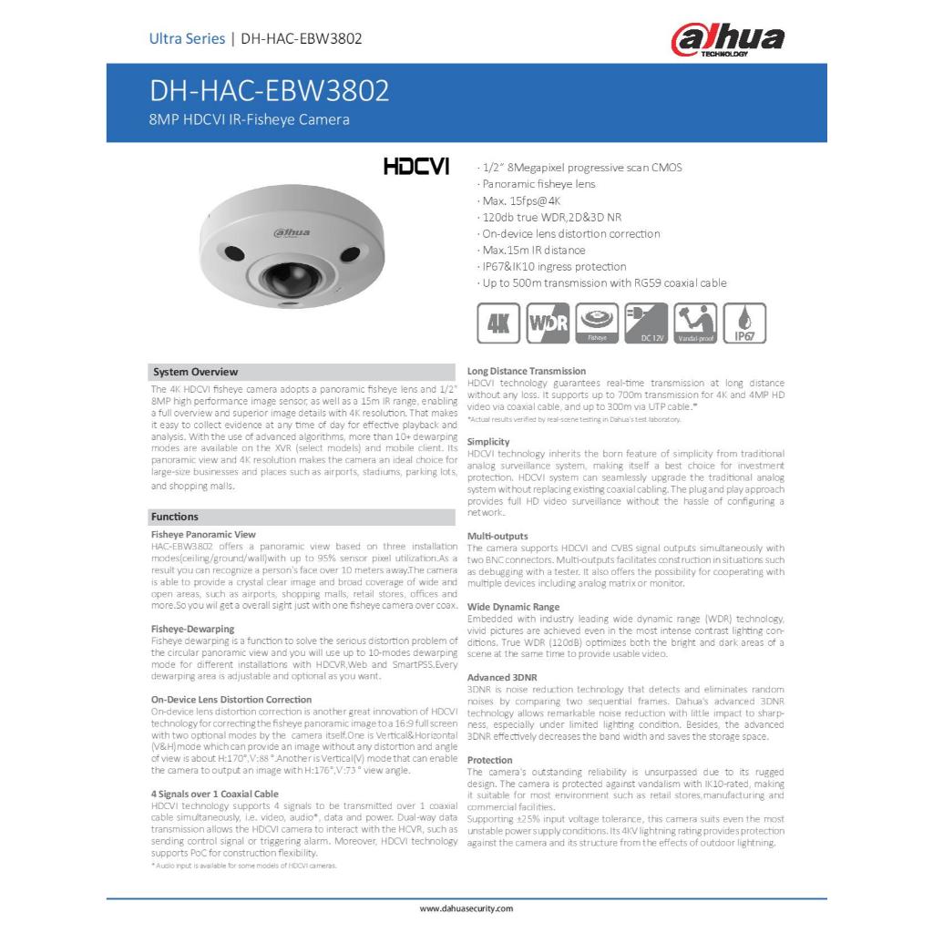 DAHUA DH-HAC-EBW3802 Analog 8MP Fixed Lens True WDR Built-in Mic HDCVI IR Panoramic Fisheye Camera CCTV