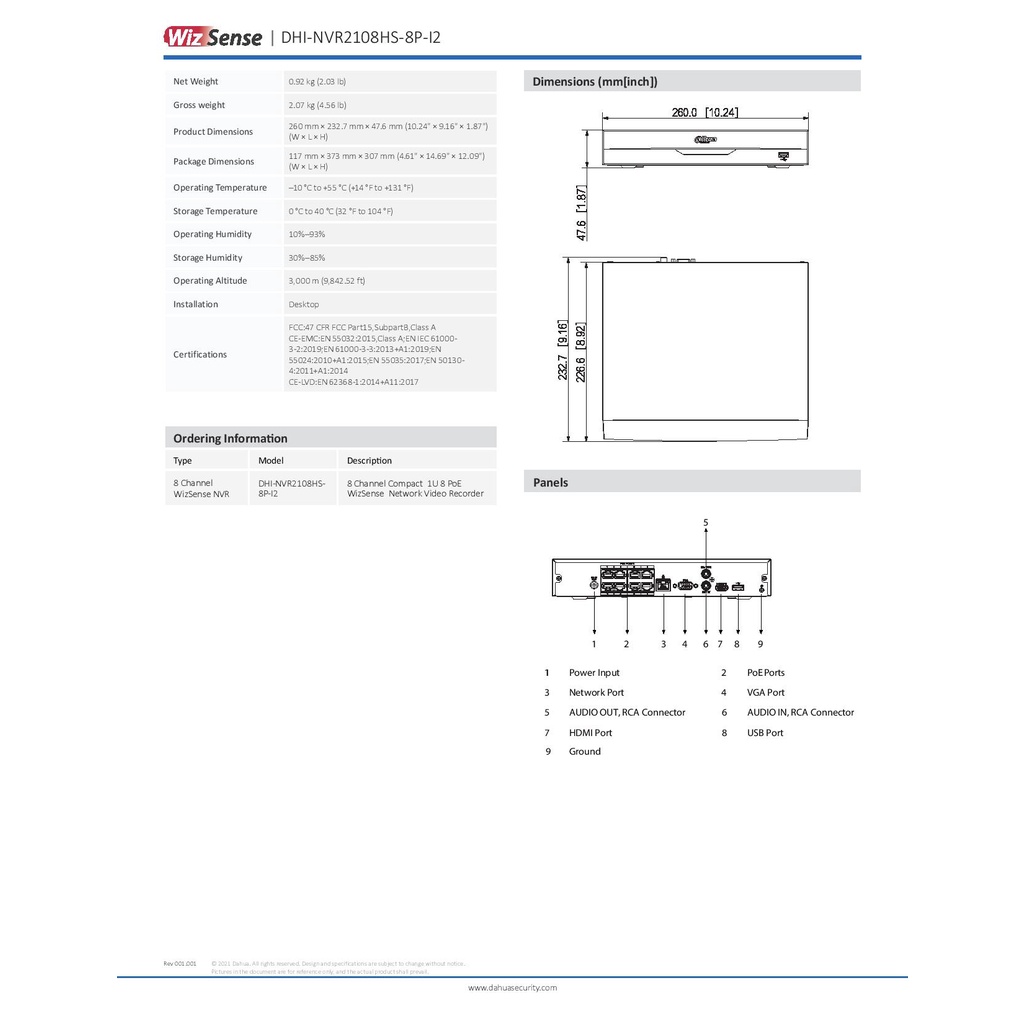 DAHUA NVR2108HS-8P-I2 Network 8CH 4K H.265 Compact 1U Build In 8PoE Port With 1HDD Slot WizSense Network Video Recorder