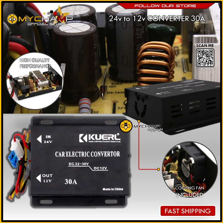 KUERL DC 24V to 12V 30A Car Power Converter Transformer for Truck, Bus, DVD, Audio Systems.