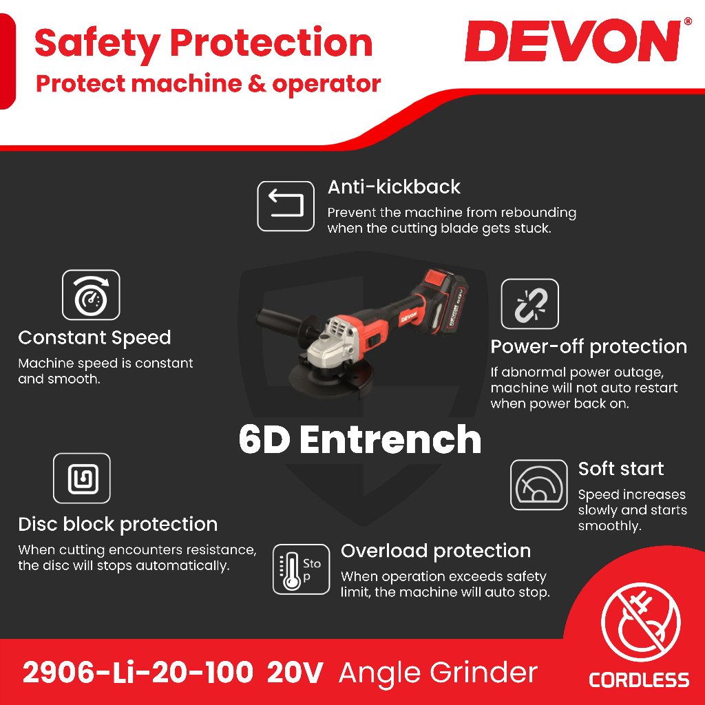 DEVON 2906-Li-20Z-100 / 2906-Li-20-100 20V Cordless Brushless Angle Grinder 4" 100mm