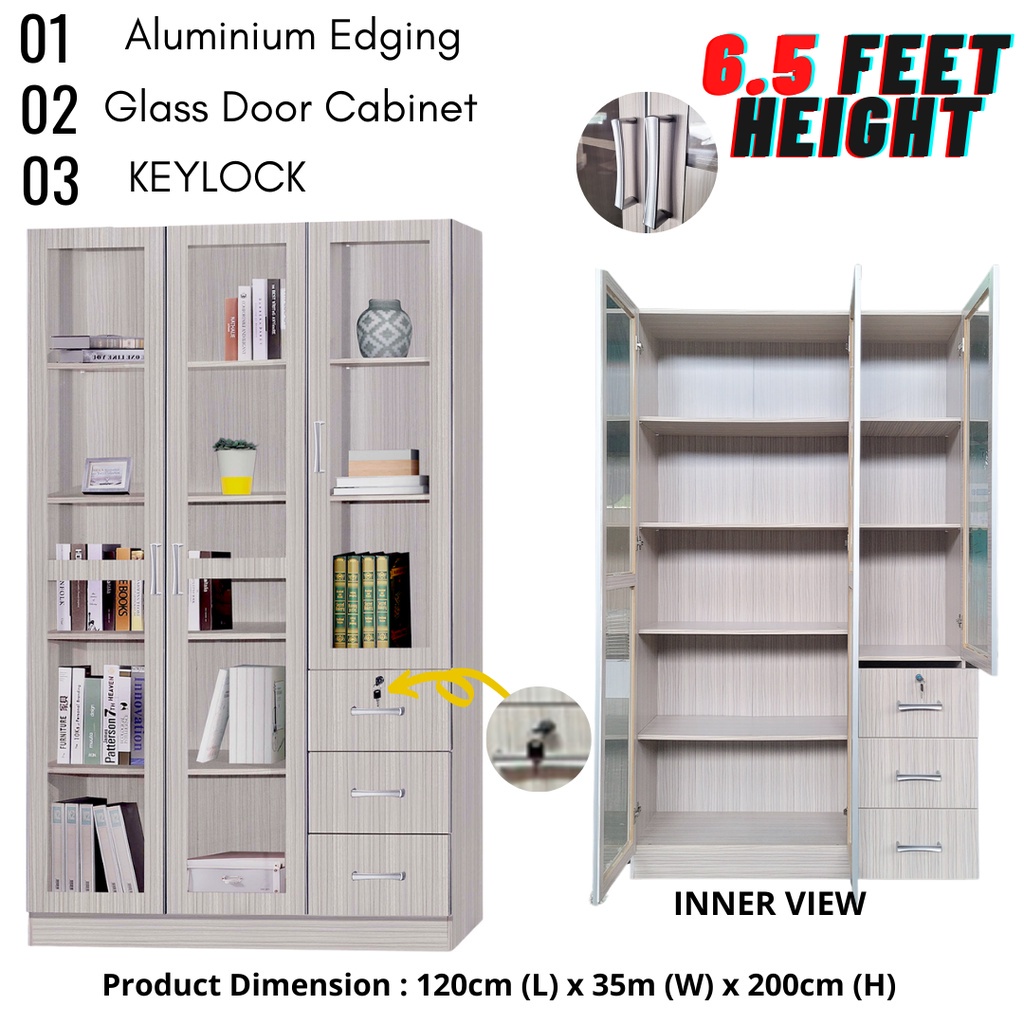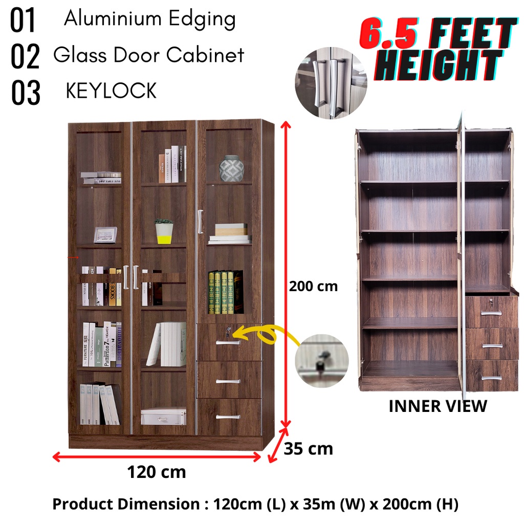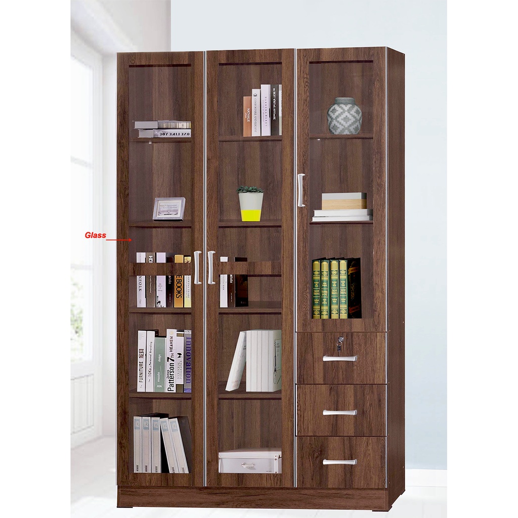DFP Perabot Almari Buku Kabinet 3 Pintu Kaca Display Cabinet 3 Glass Door 3 Drawer Cupboard Storage Cabinet Light Brown