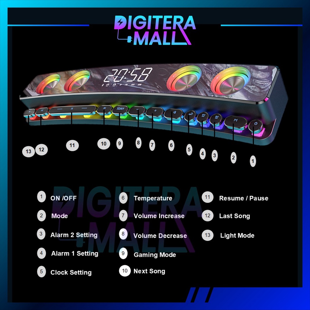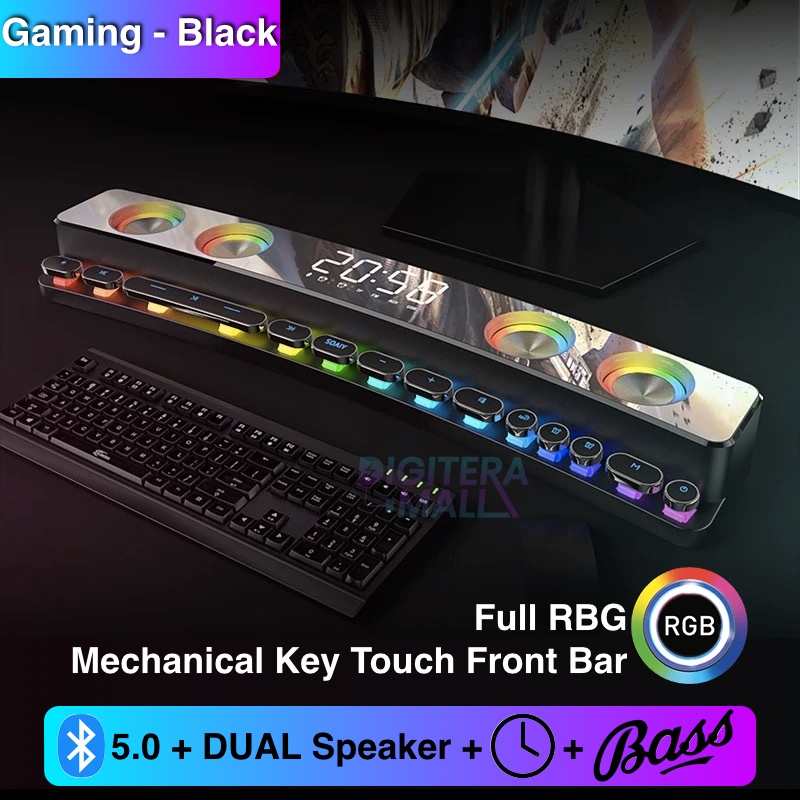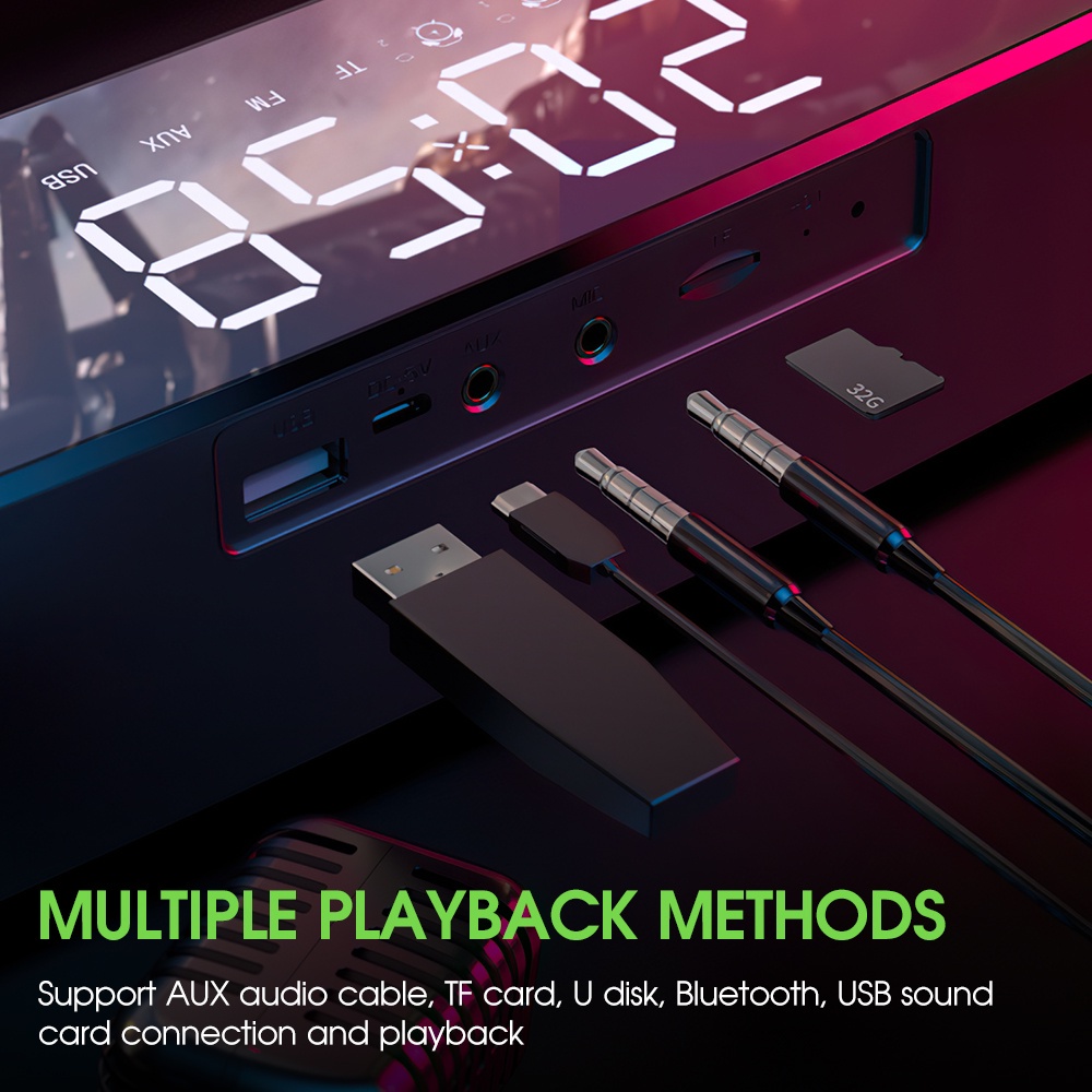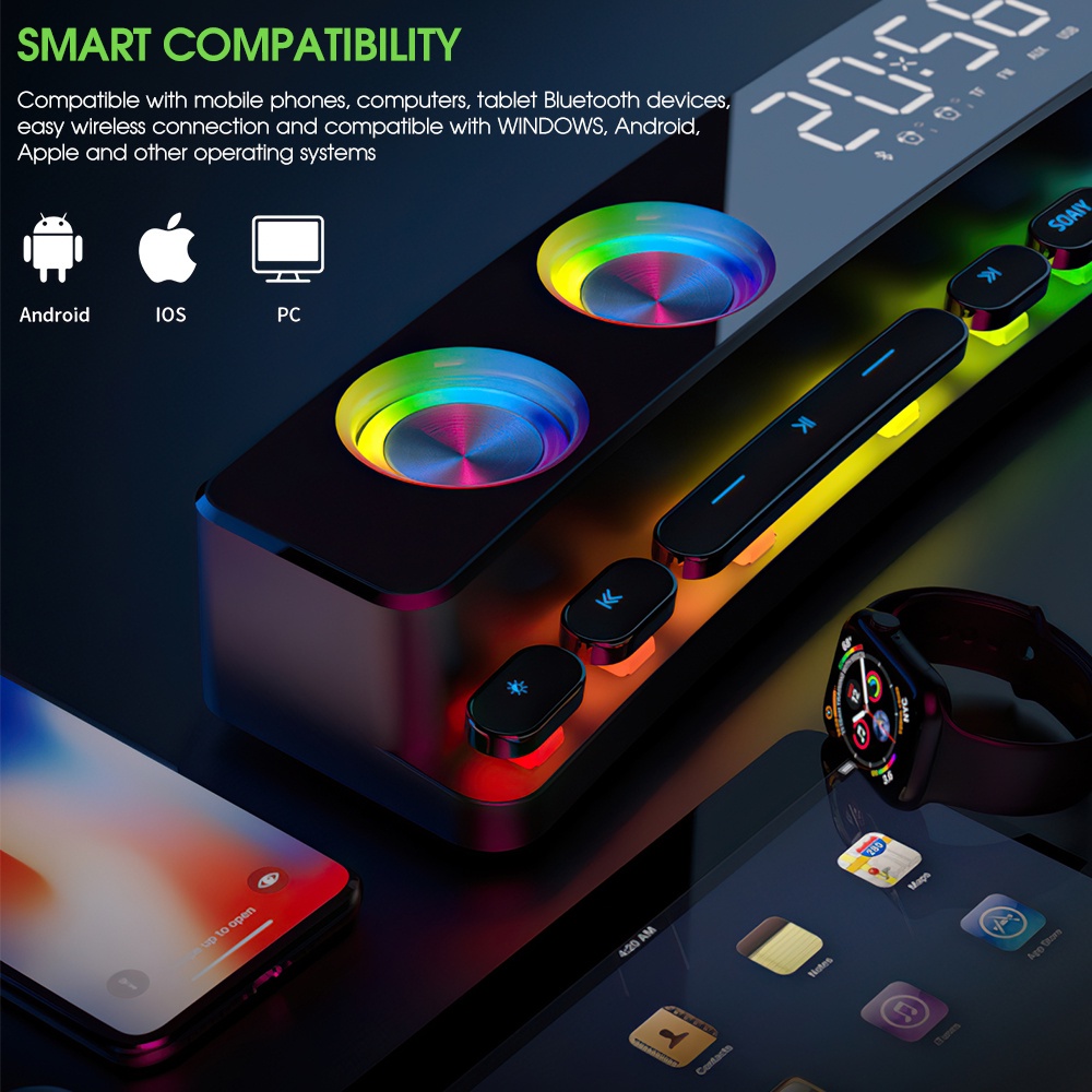 DIGITERA Gaming Speaker RGB Soundbar Wireless with Clock 3D Surround HIFI Sound LED Alarm USB Bass AUX for Gamer