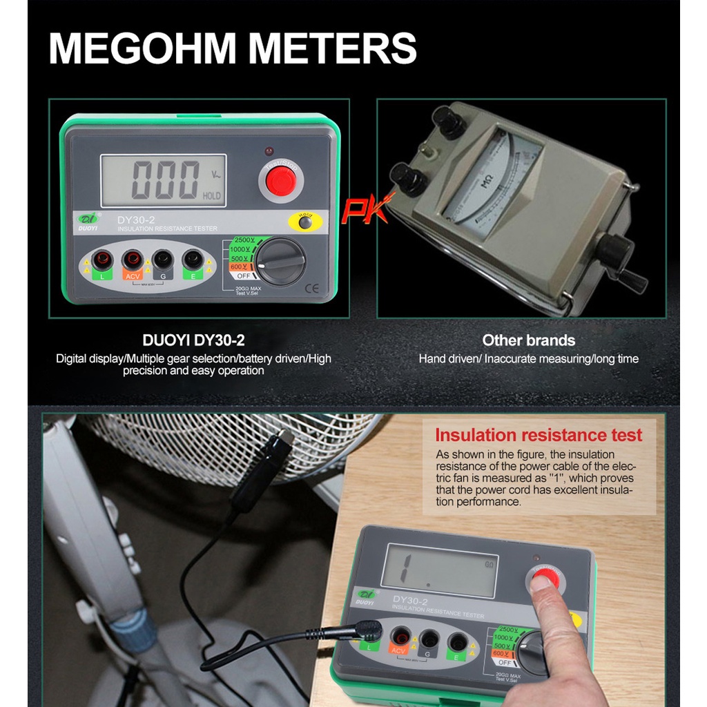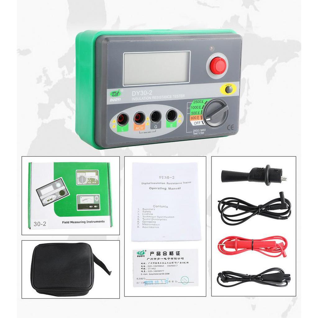 DUOYI DY30-2 Digital Insulation Tester Tools 20G Ohm LCD Display 500V/1000V/ 2500V Earth Ground Resistance Meter Megohmmeter